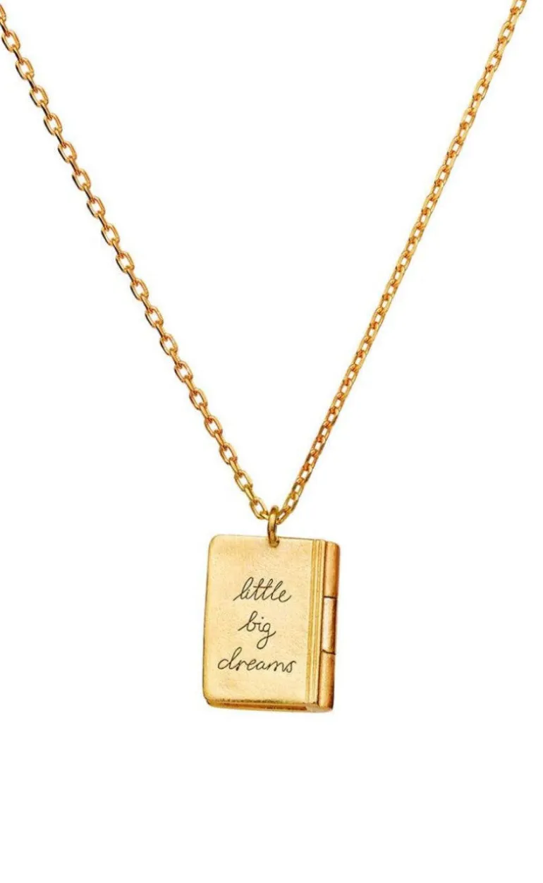 Halskæden har en lille bog som vedhæng med ordene “Little big dream” indgraveret på bagsiden.