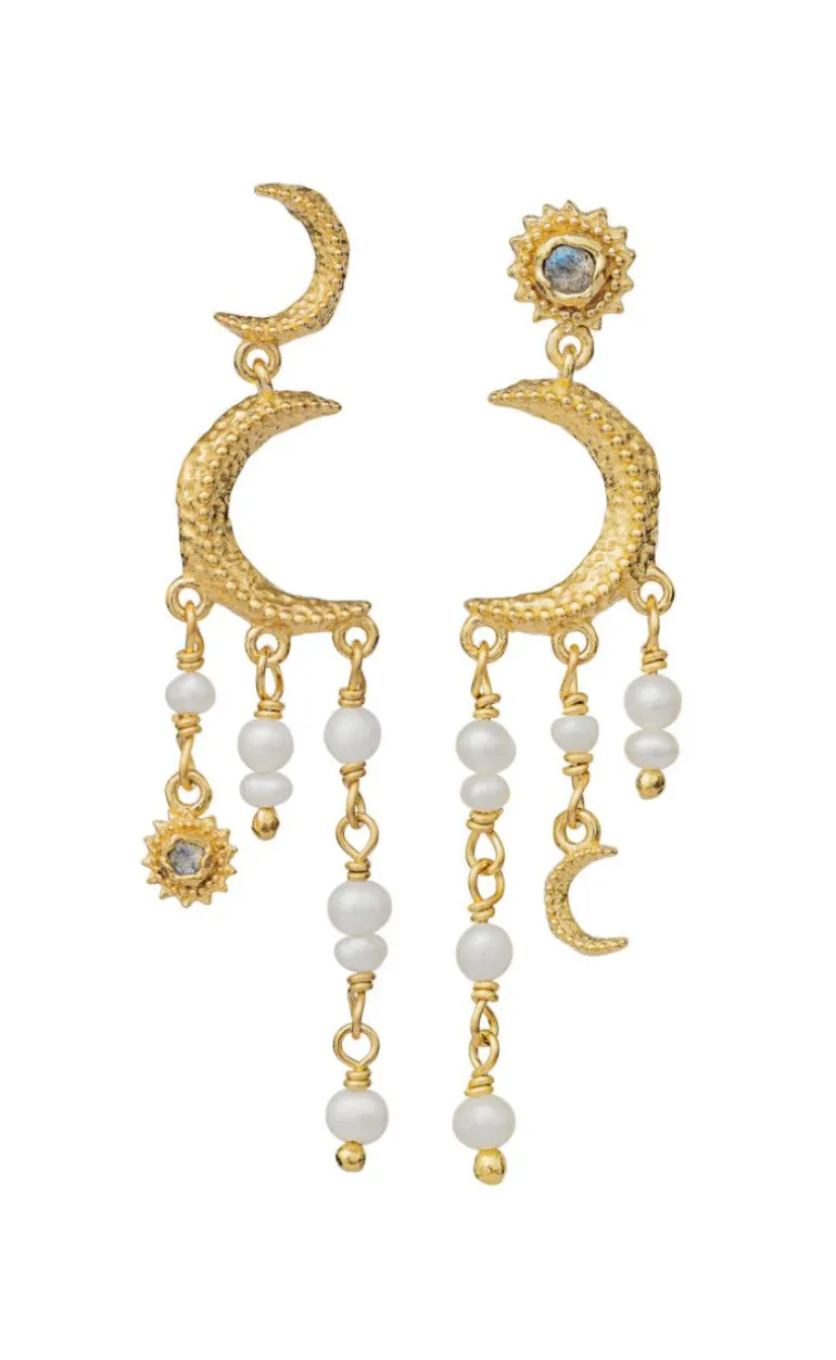 Øringene har en variation af ferskperler og guld ringe hængende ned langs øret. Samt udsmykket med smukke sol og måne symboler.