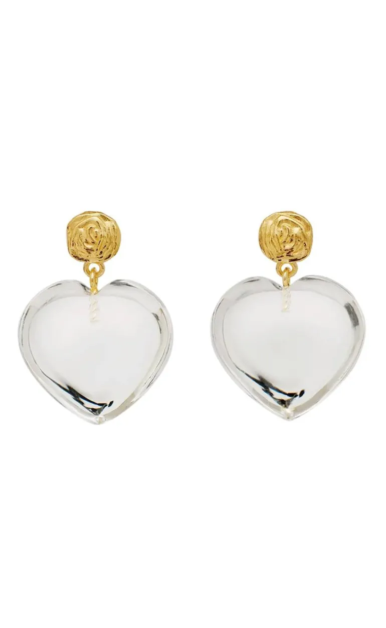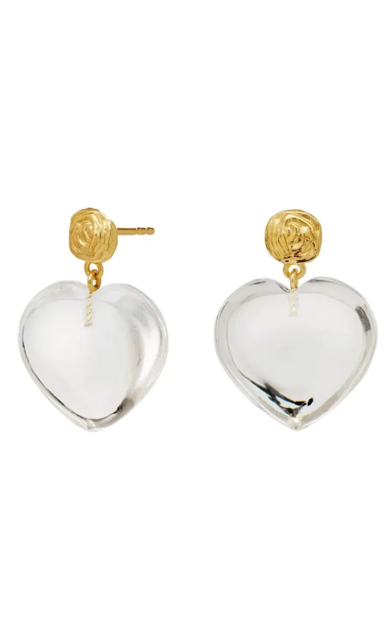 Pæne store øreringe i guld, med et hjerte af en bjergkrystal.