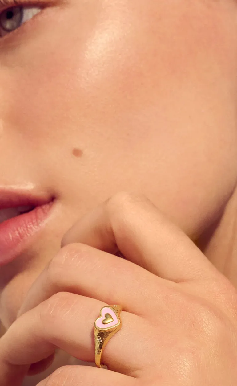 Unik ring fra Maanesten i guld, med en lyserød hjerte form.