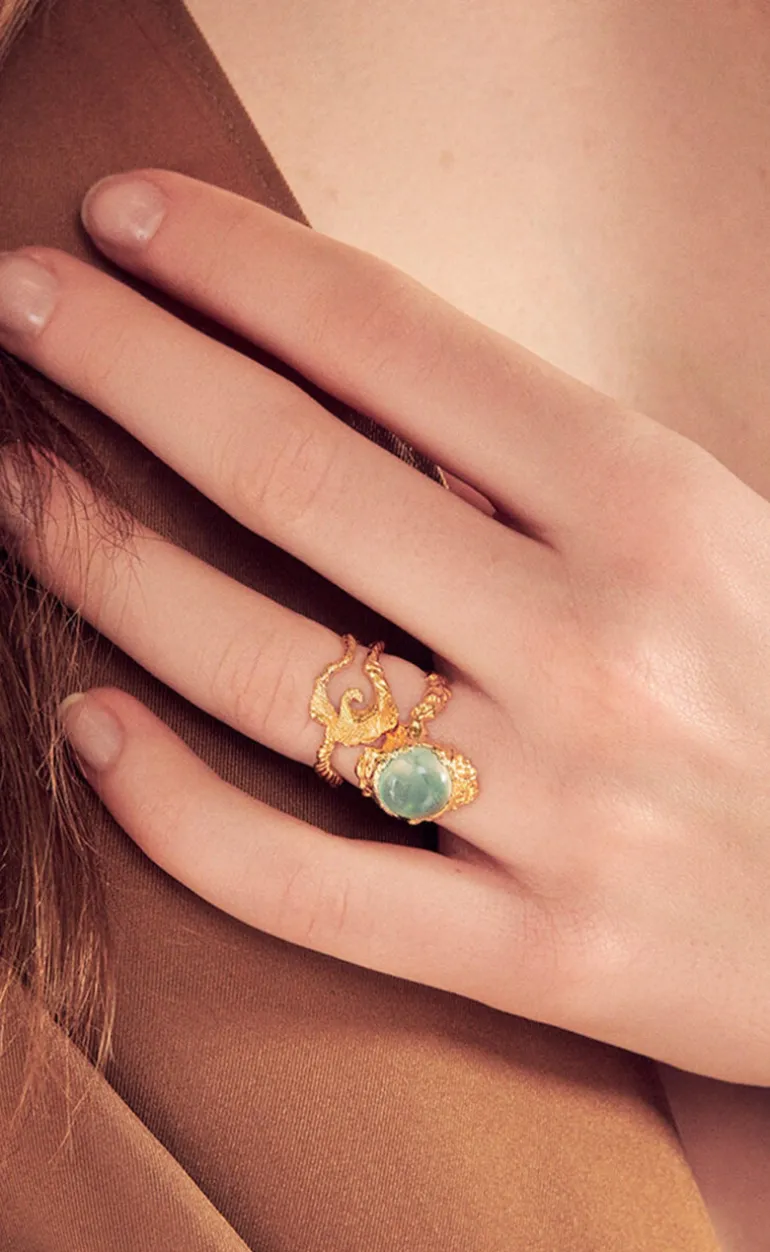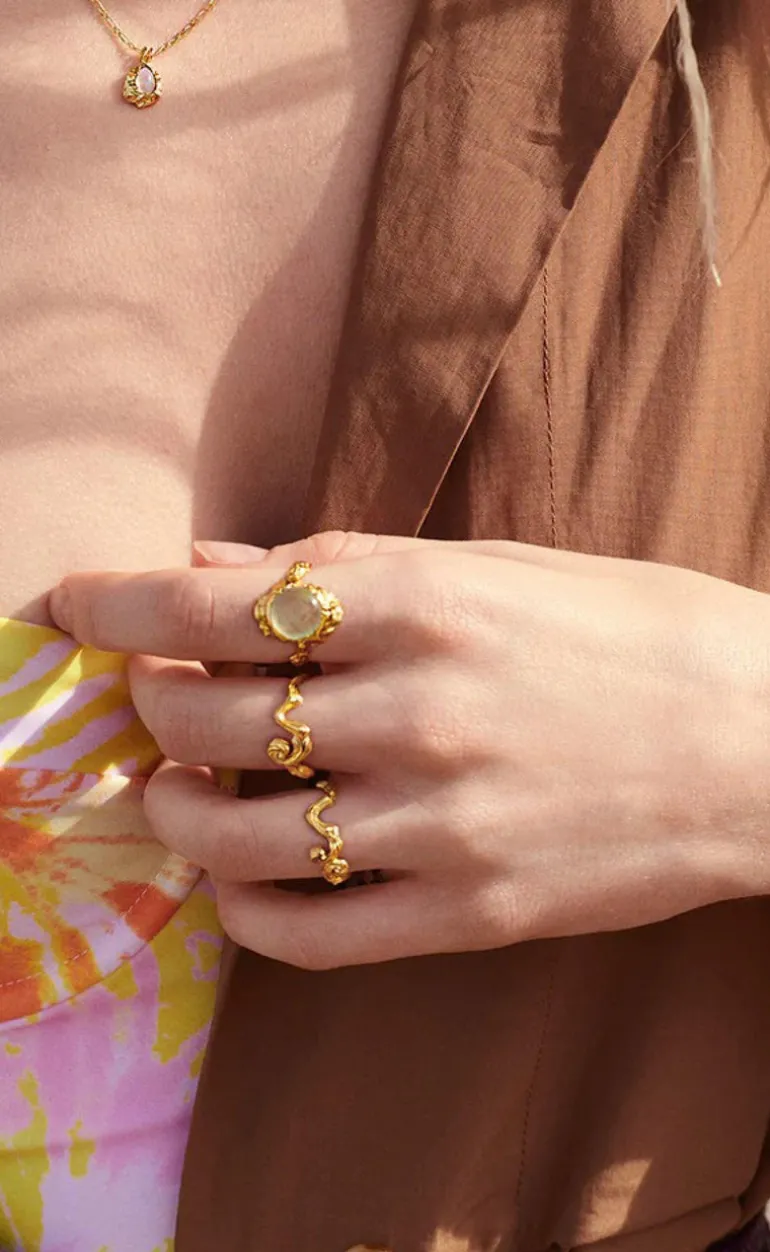 Smuk ring fra Maanesten i guld, med en grøn perle i midten.