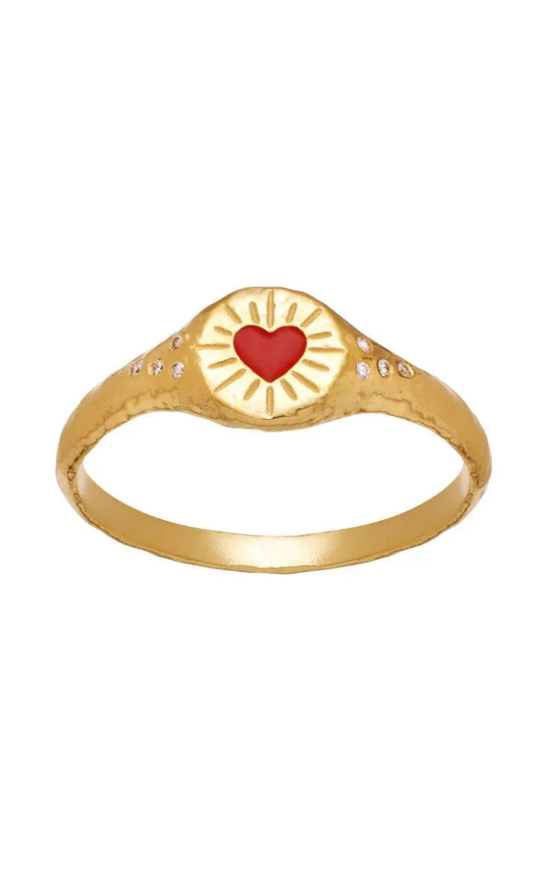 Fin og simpel ring fra Maanesten i guld, med et rødt hjerte i midten.