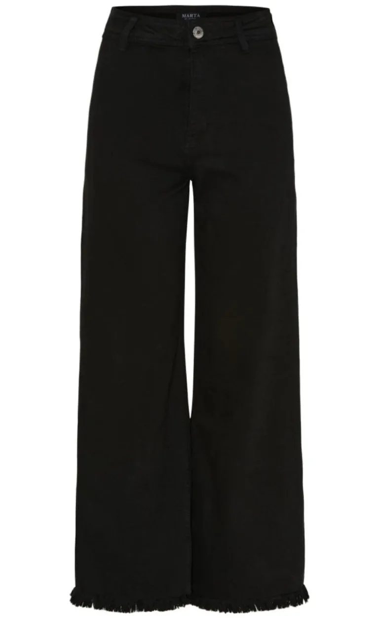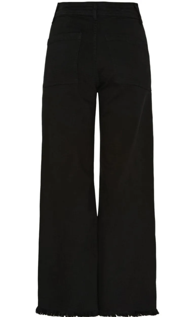 Bukserne har en smule vidde i benene og har en optrevlet bund.