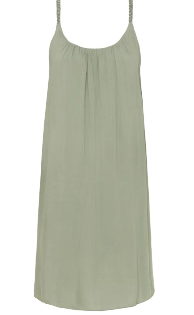 Kjolen har en rund halsudskæring, diskrete rynk i toppen og en afslappet pasform.