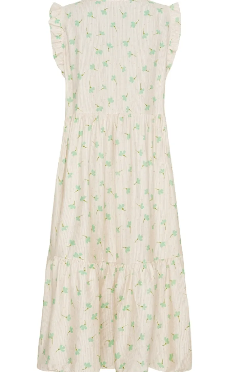 Kjolen er ærmeløs, har en v-udskæring og fine skæringer ned langs kjolen.