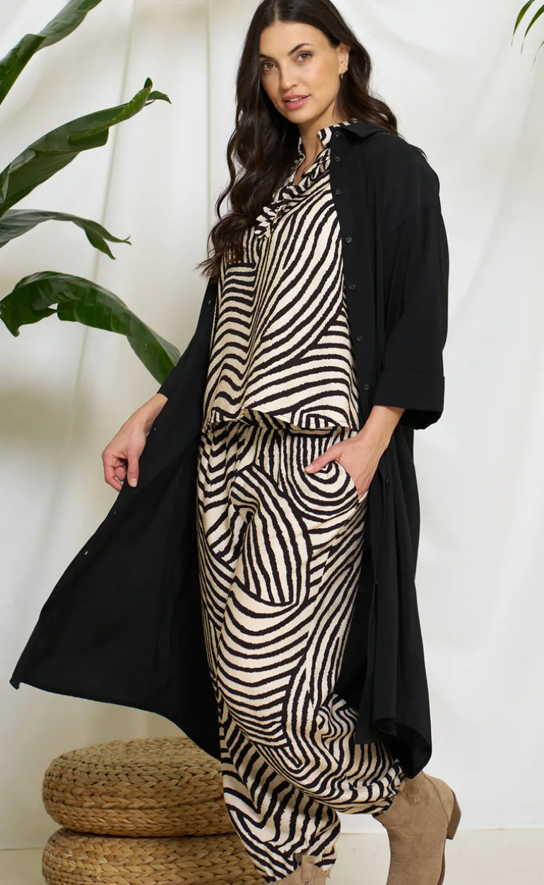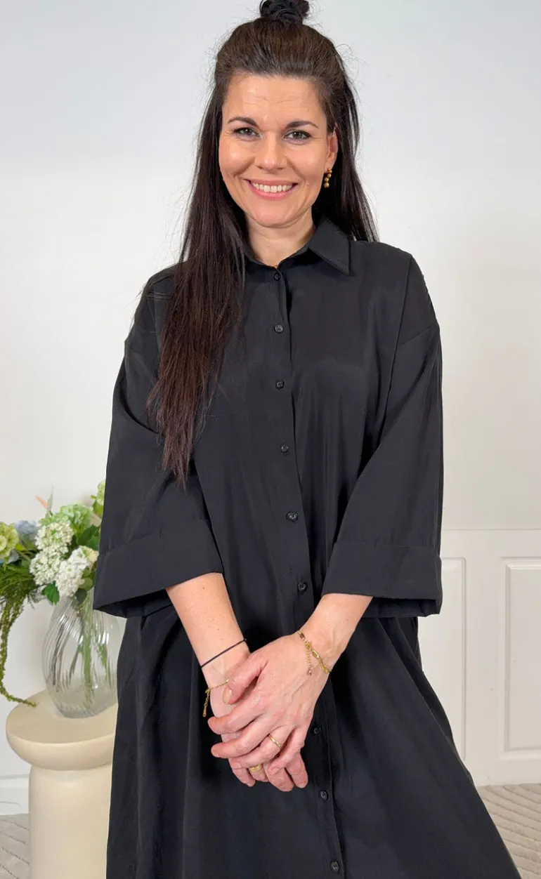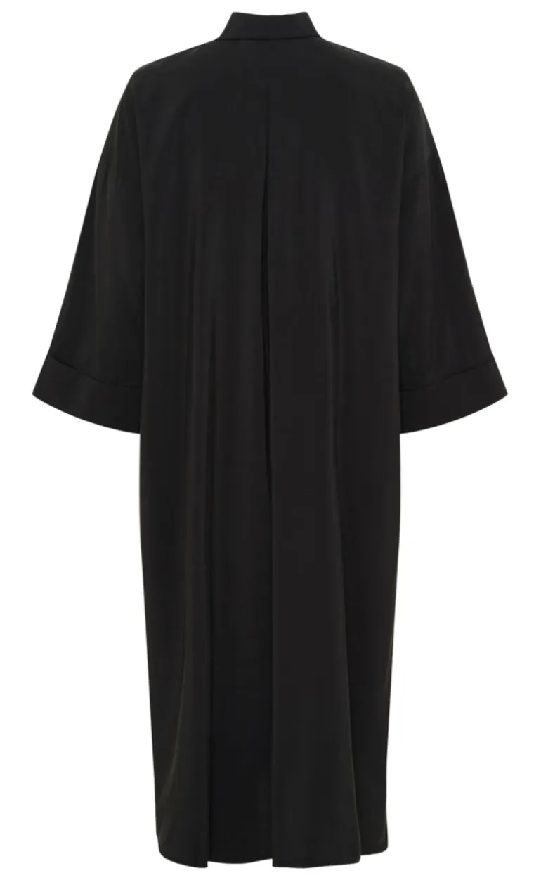 Simpel kjole fra Marta Du Chateau i sort, som er gennemknappet og har lange ærmer.