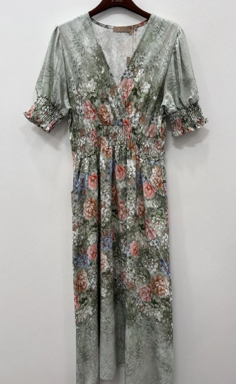 Kjolen har en v-hals og korte ærmer med elastikkant.