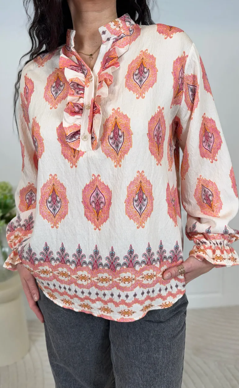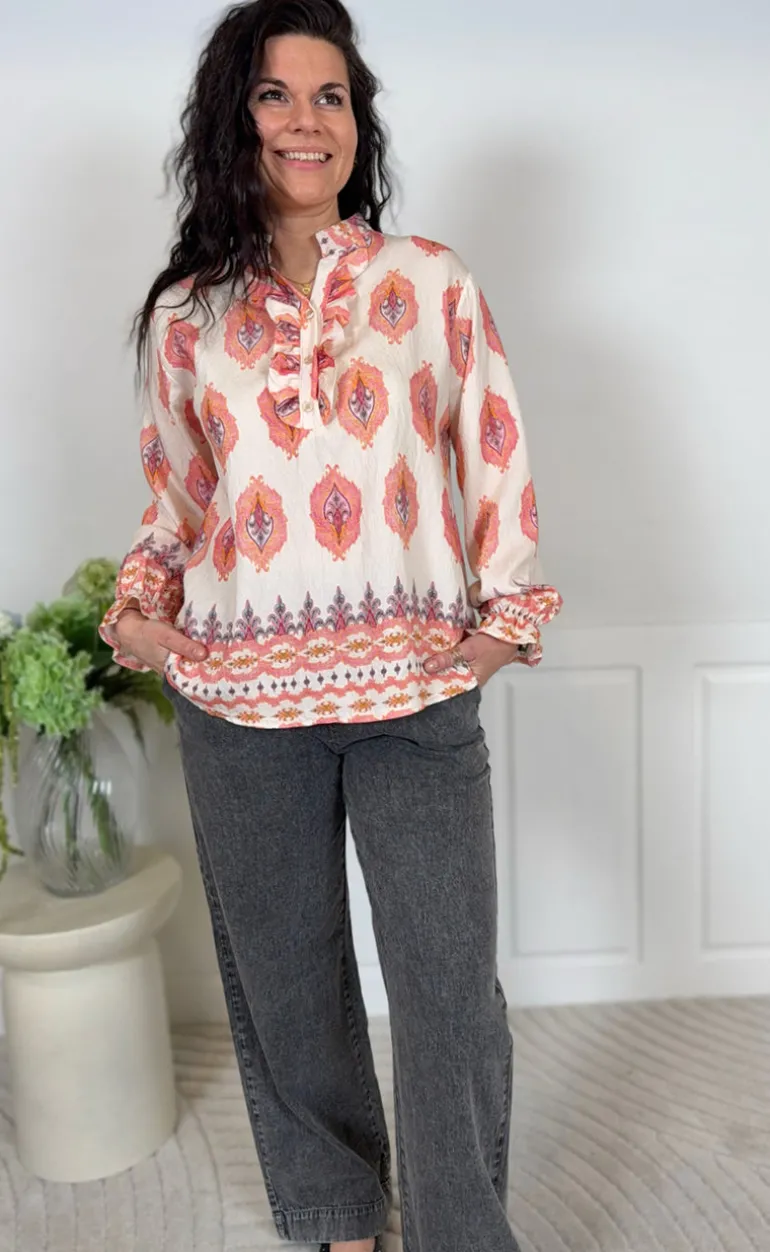 Skjorten har en knaplukning med flæsedetaljer foroven.
