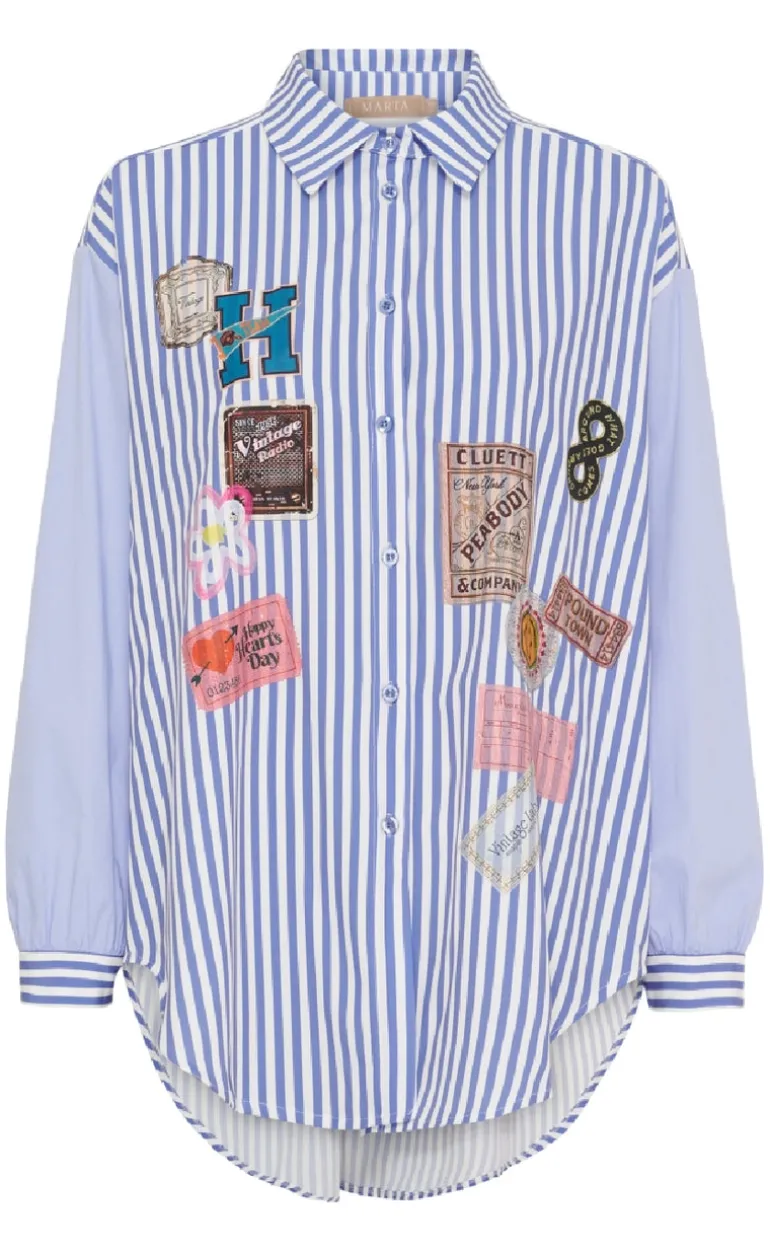 Flot skjorte fra Marta Du Chateau i et blå stribet print, med fine motiver rundt på skjorten.