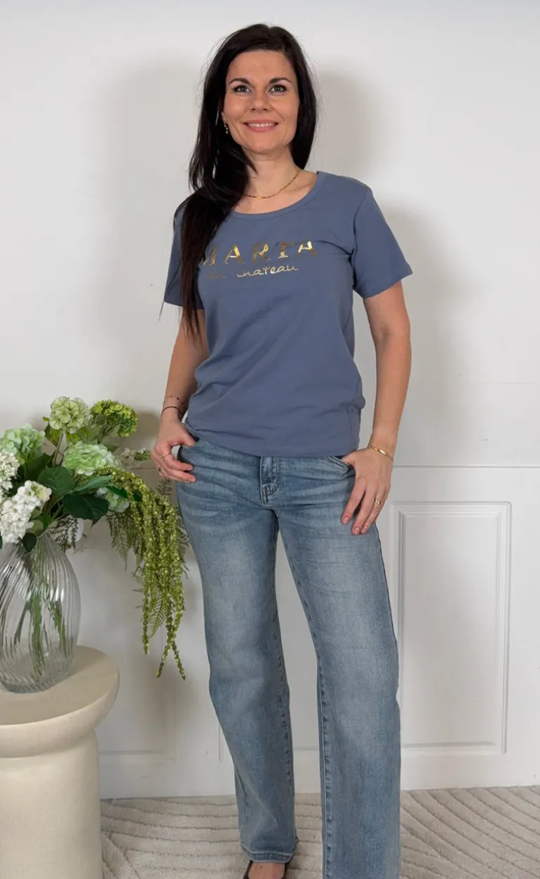Sød t-shirt fra Marta Du Chateau i denim blå, med guld skrift på brystet.