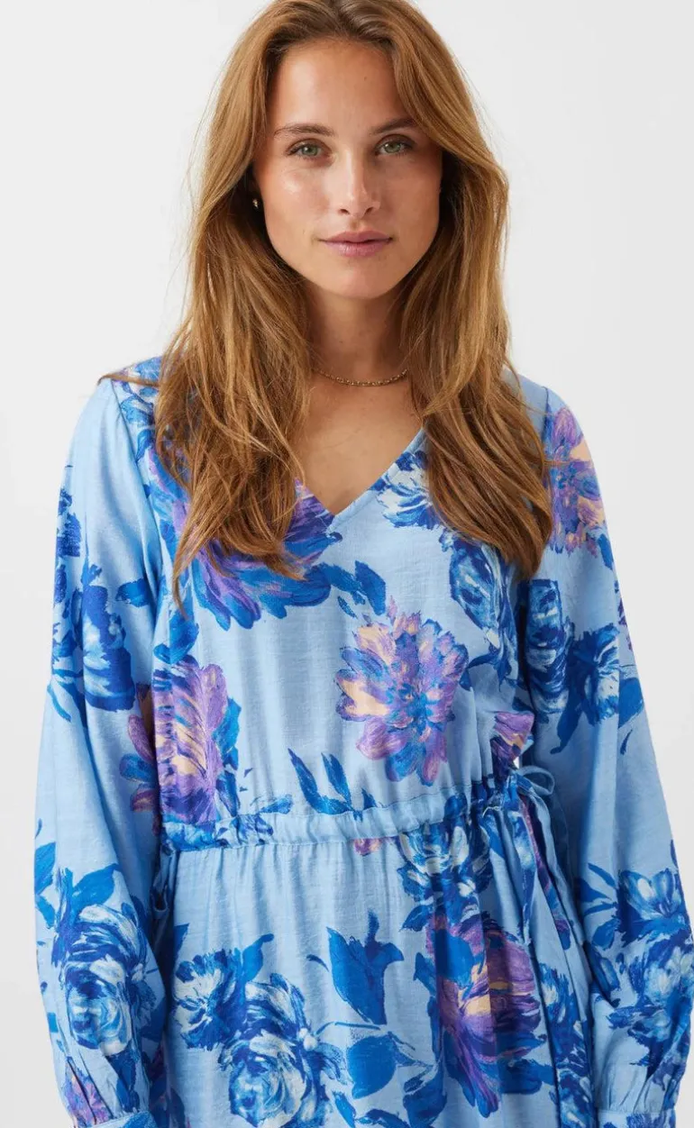 Kjolen er tætsiddende, men med meget stræk. Den har lange ærmer og en smart udskæring ved skulderen.