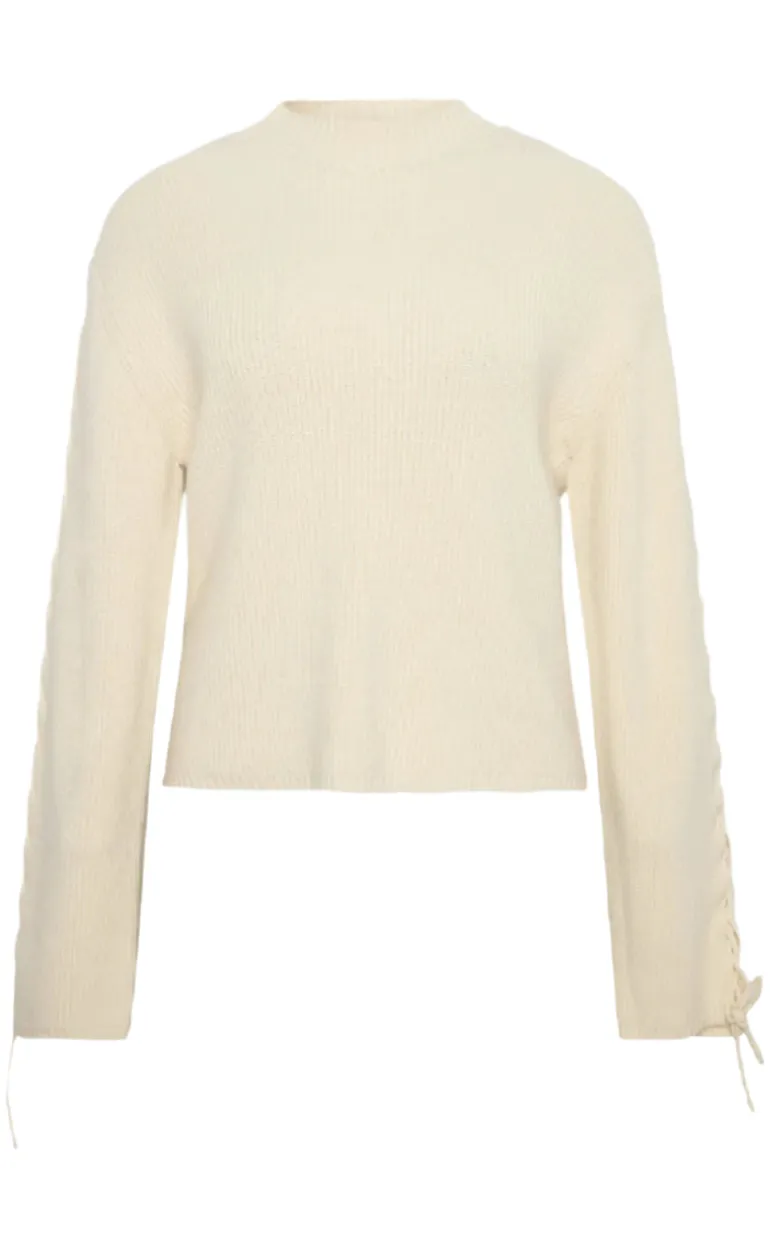 Trendy strik bluse fra Moves i beige, med et ribbet look og bindedetaljer hos ærmet.