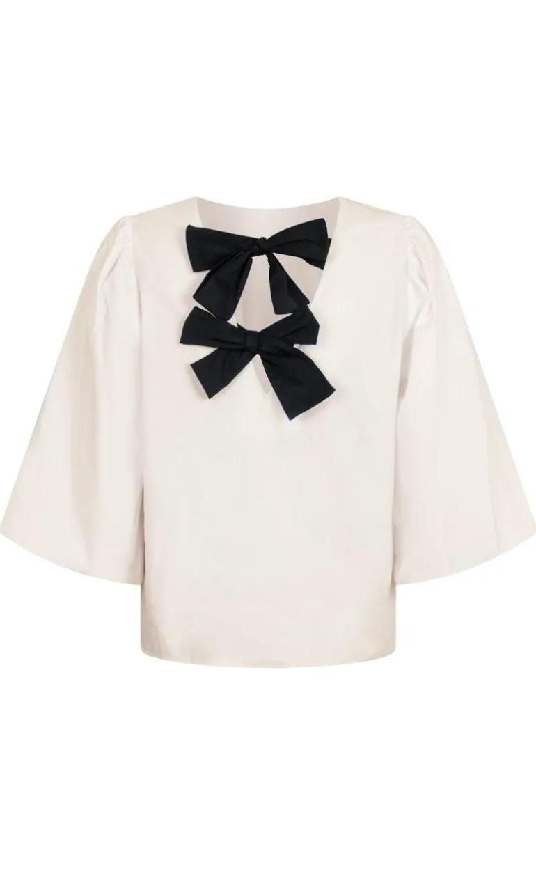 Smuk vendbar bluse fra Neo Noir i en creme hvid med sorte sløjfer. Blusen er vendbar, så sløjferne både kan være for- og bagtil.