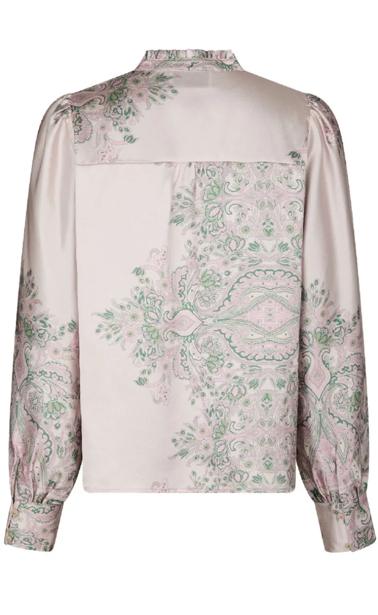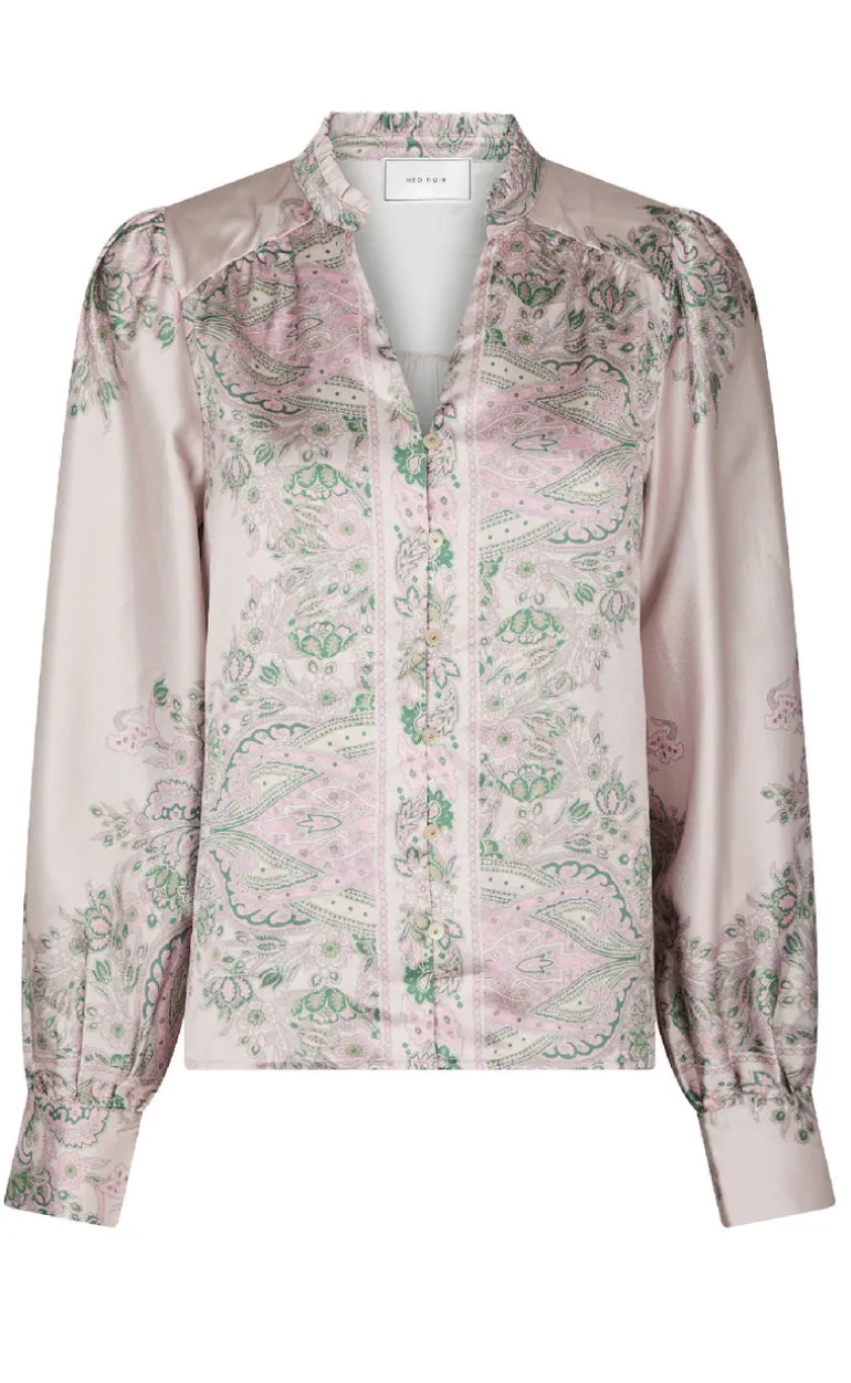 Feminin og elegant bluse med et smukt paisley print fra Neo Noir. Blusen har lange ærmer og går ned i et V foran med dekorative knapper.