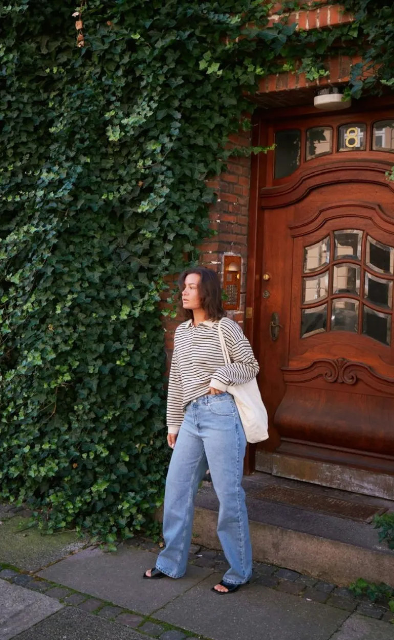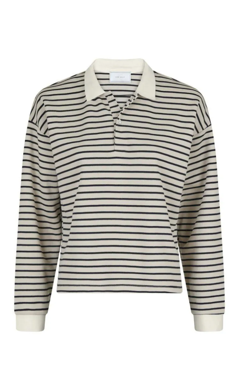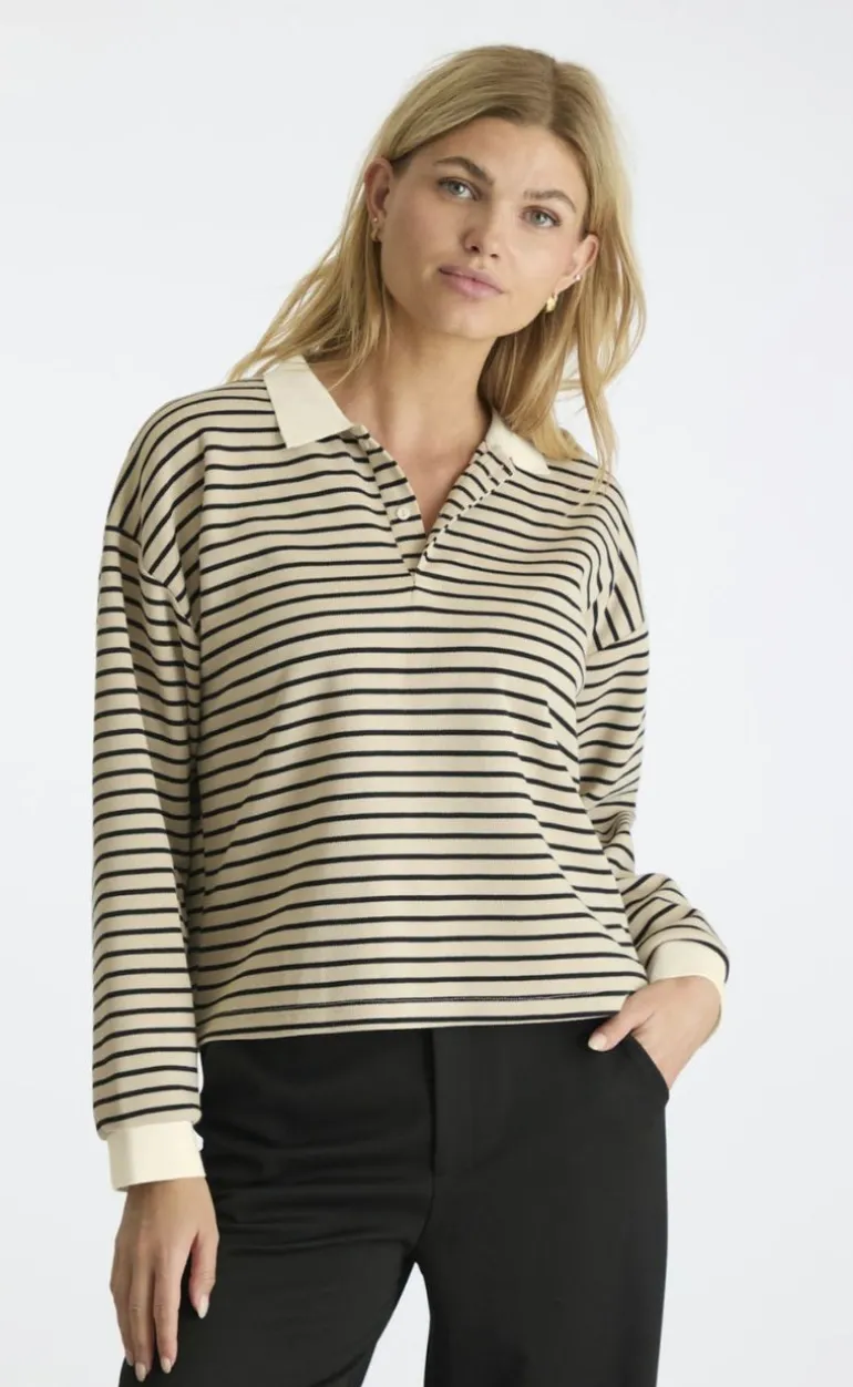 Bluse med lille krav i polo look. Pasformen er semi løs og kvaliten er blød med striber.