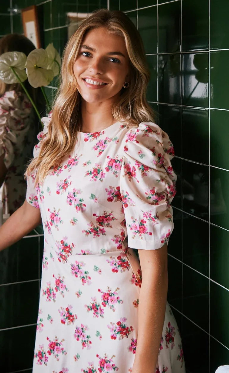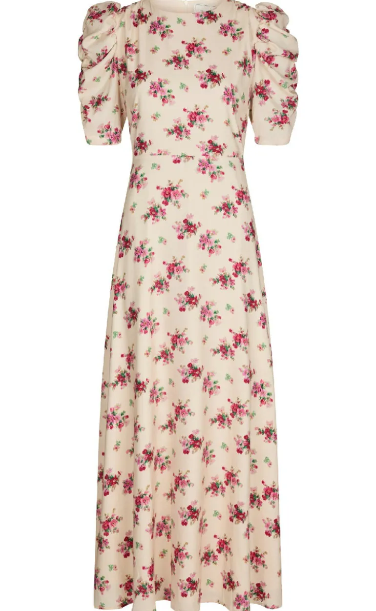 Kjolen har korte pufærmer, en rund hals samt en skæring i taljen.