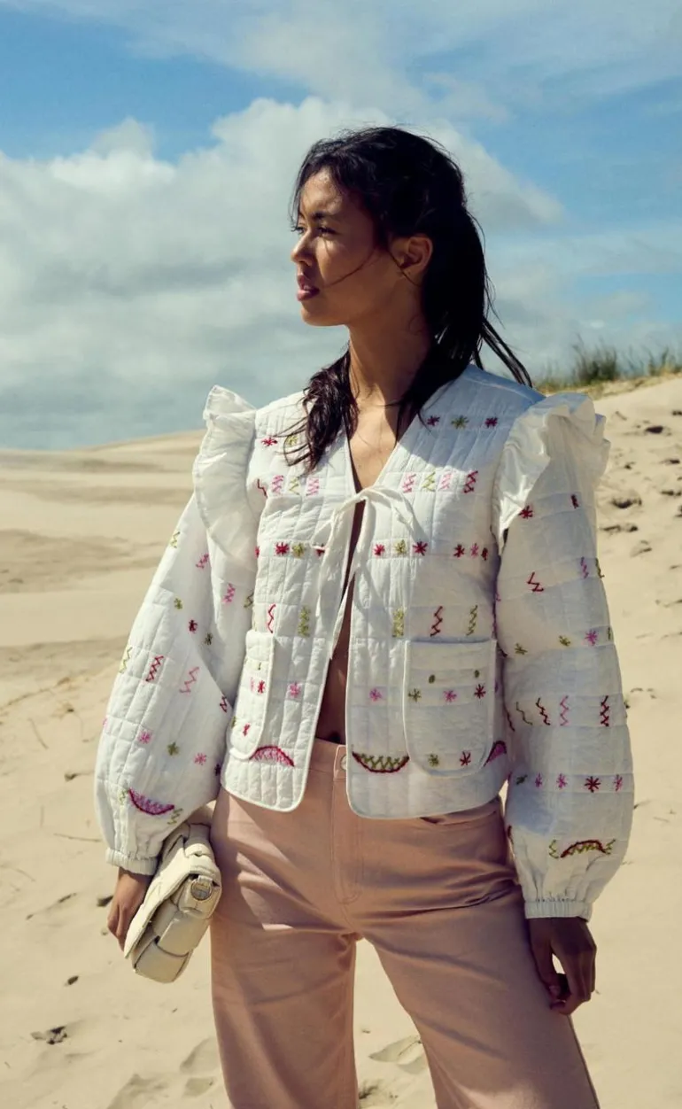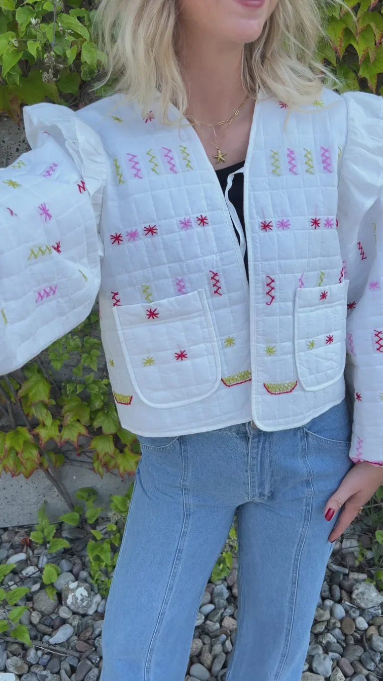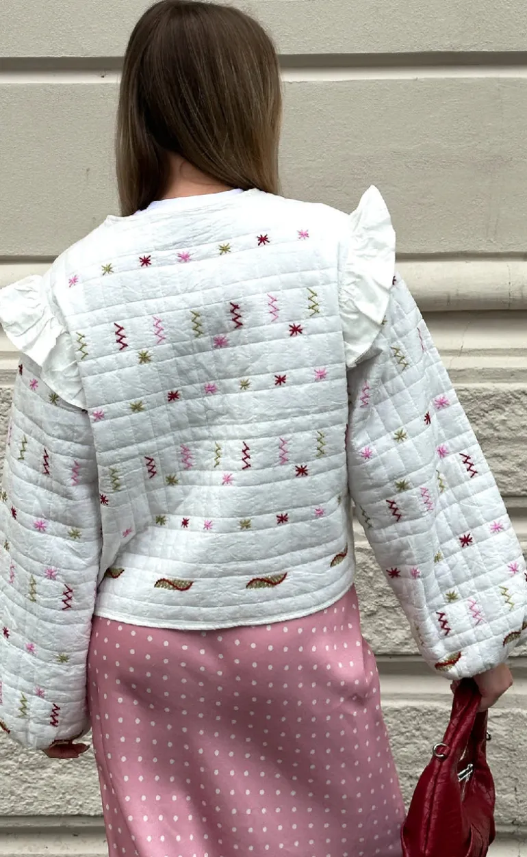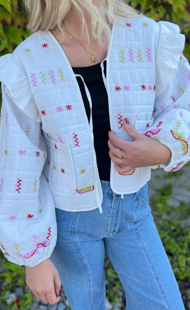 Fin og elegant jakke, i hvid med røde detaljer.