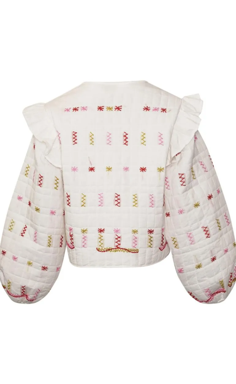 Jakken har frynser ved ærmet, bindebånd og puffærmer.