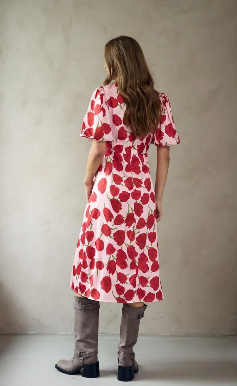 Fin kjole i rød med et blomster print.