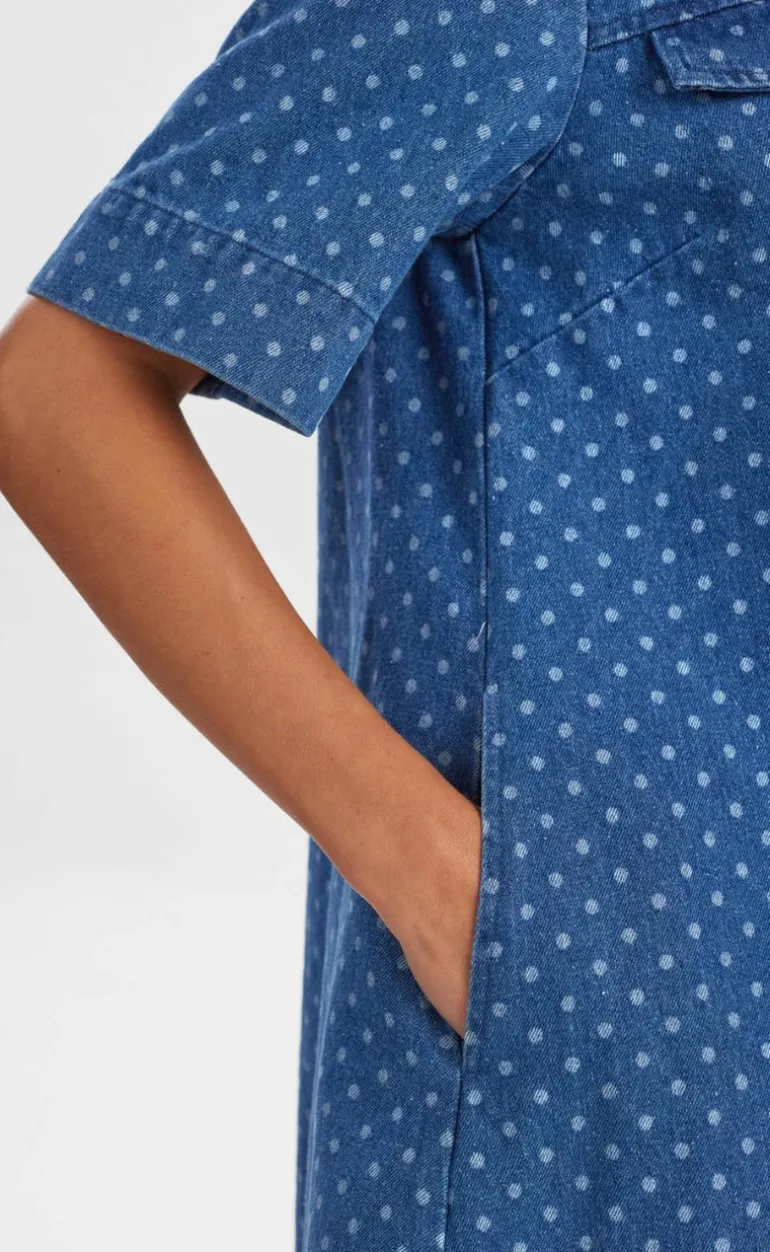 Kjolen går til knæet, har lommer, korte ærmer og en krave.