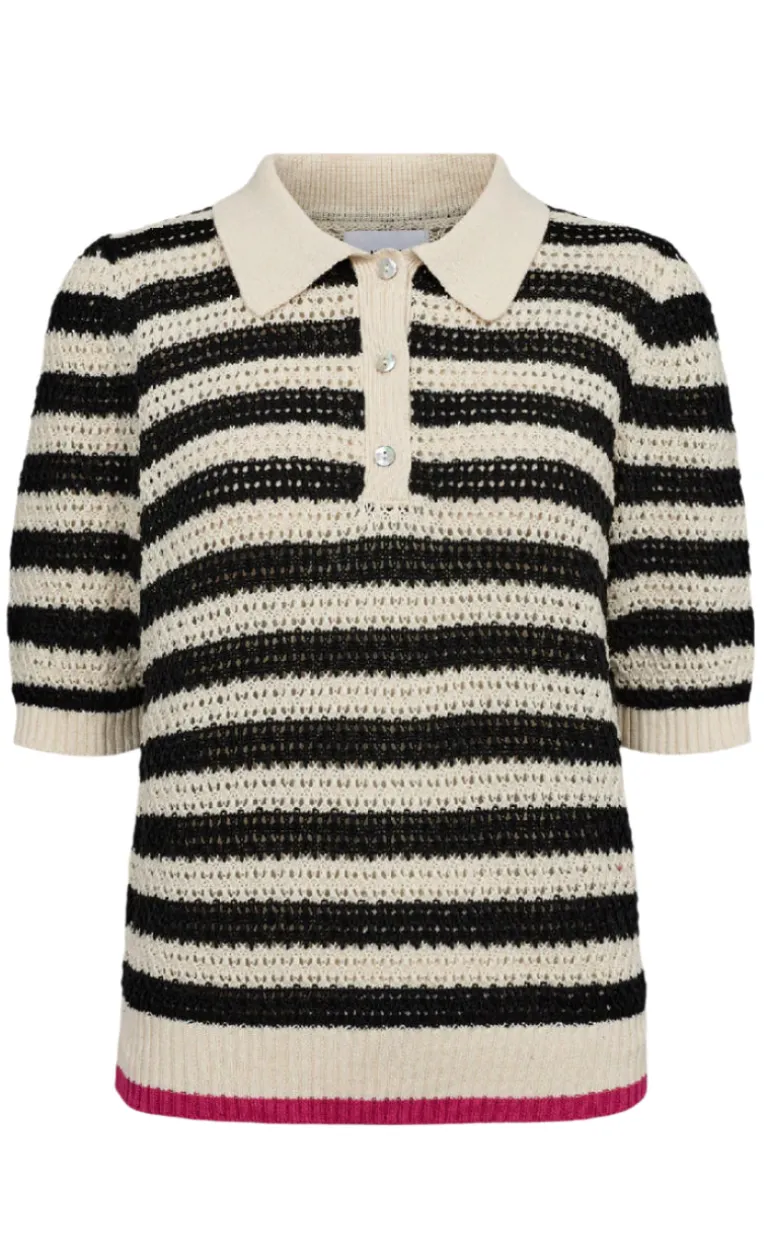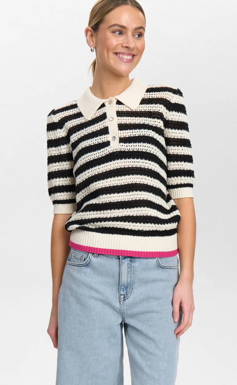 Kortærmet strikbluse fra Nümph i et sort og hvid stribet print, med en lyserødt kant forneden.