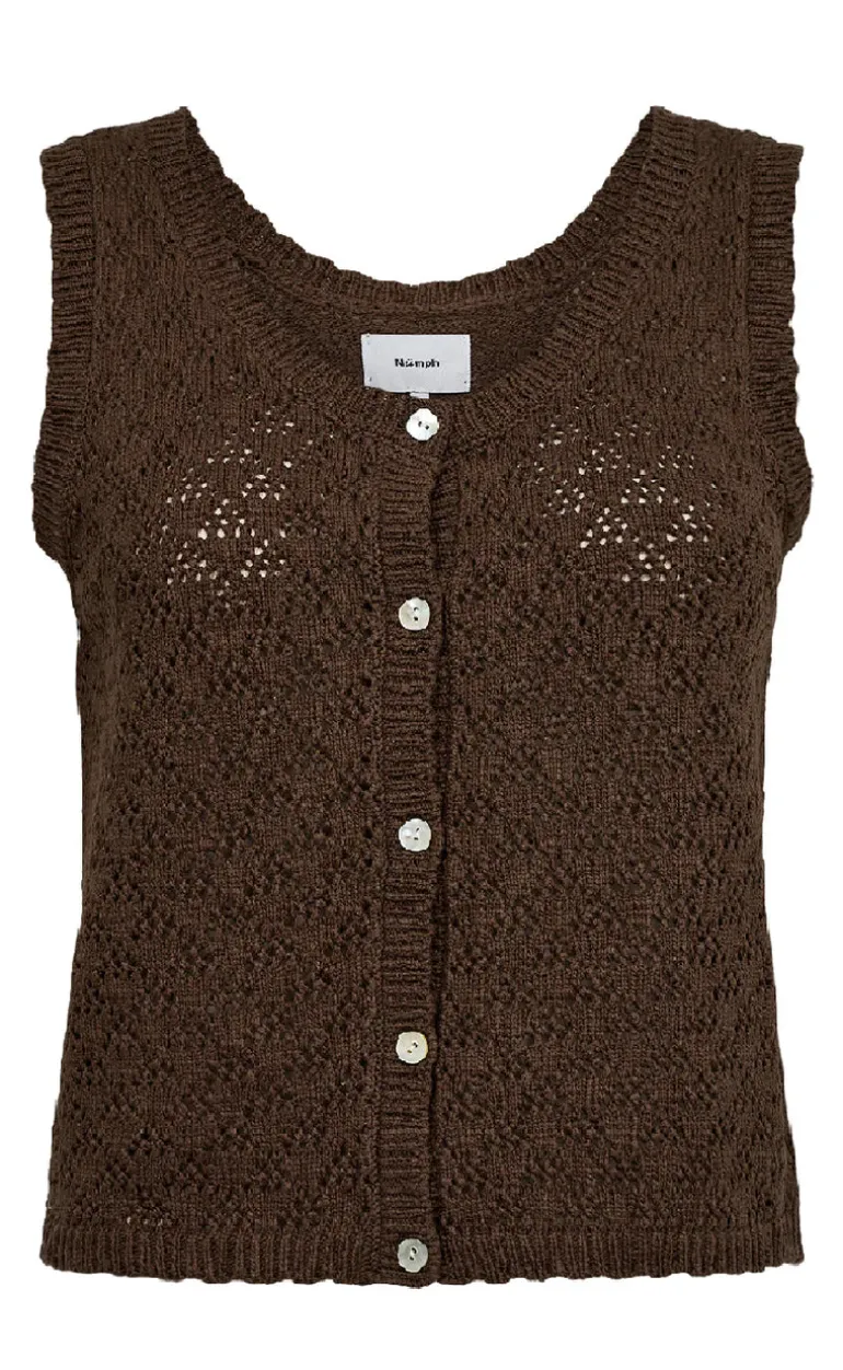Basic strik top fra Nümph i en mørkebrun farve. Toppen er gennemknappet.
