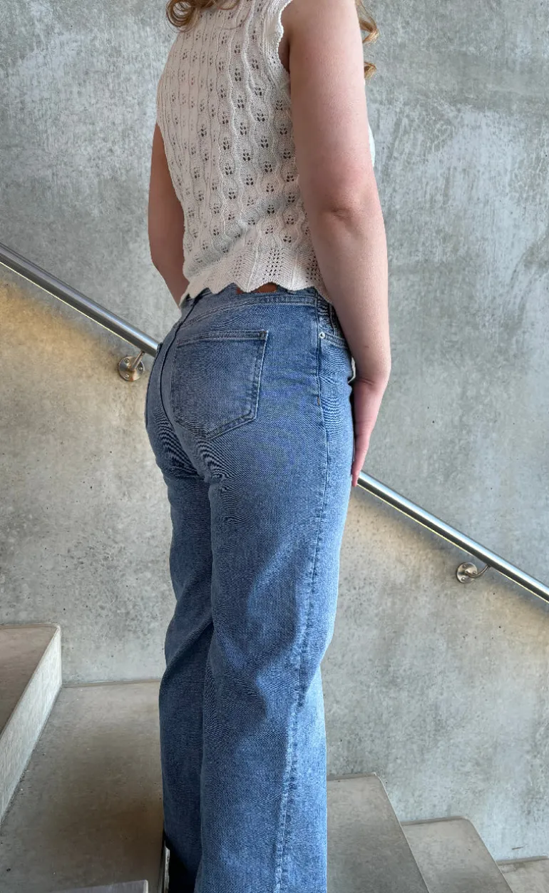 Bukserne er højtaljede, lukkes med lynlås og knap, bukserne har lommer både foran samt bagpå. Bukserne har bæltestropper, så man kan bruge et bælte og så har de rå kanter ved anklerne.