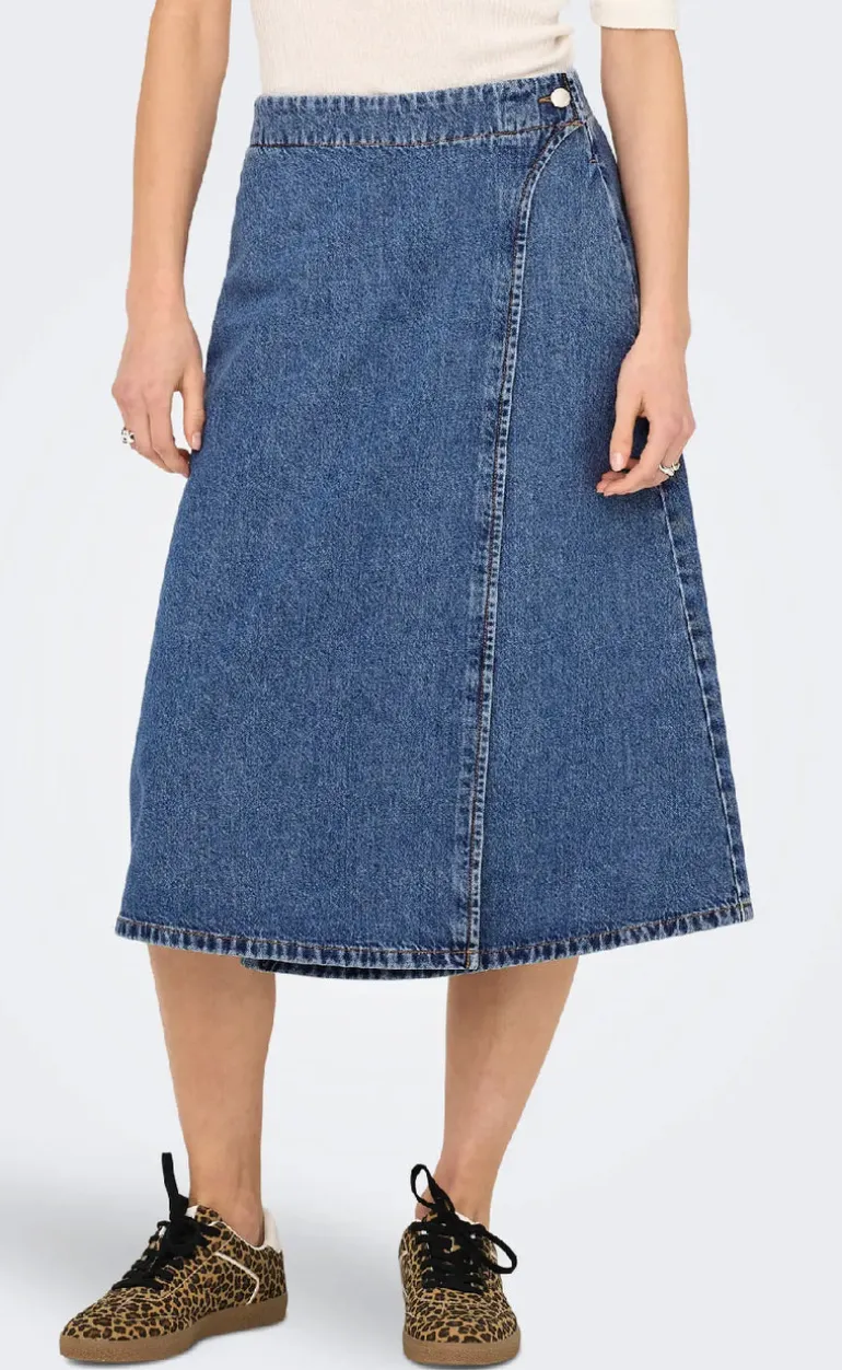 Wrap nederdel fra ONLY i en mørkeblå denim kvalitet.