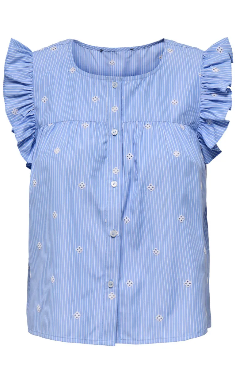 Toppen er løs og har rynkedetaljer ved ærmerne.