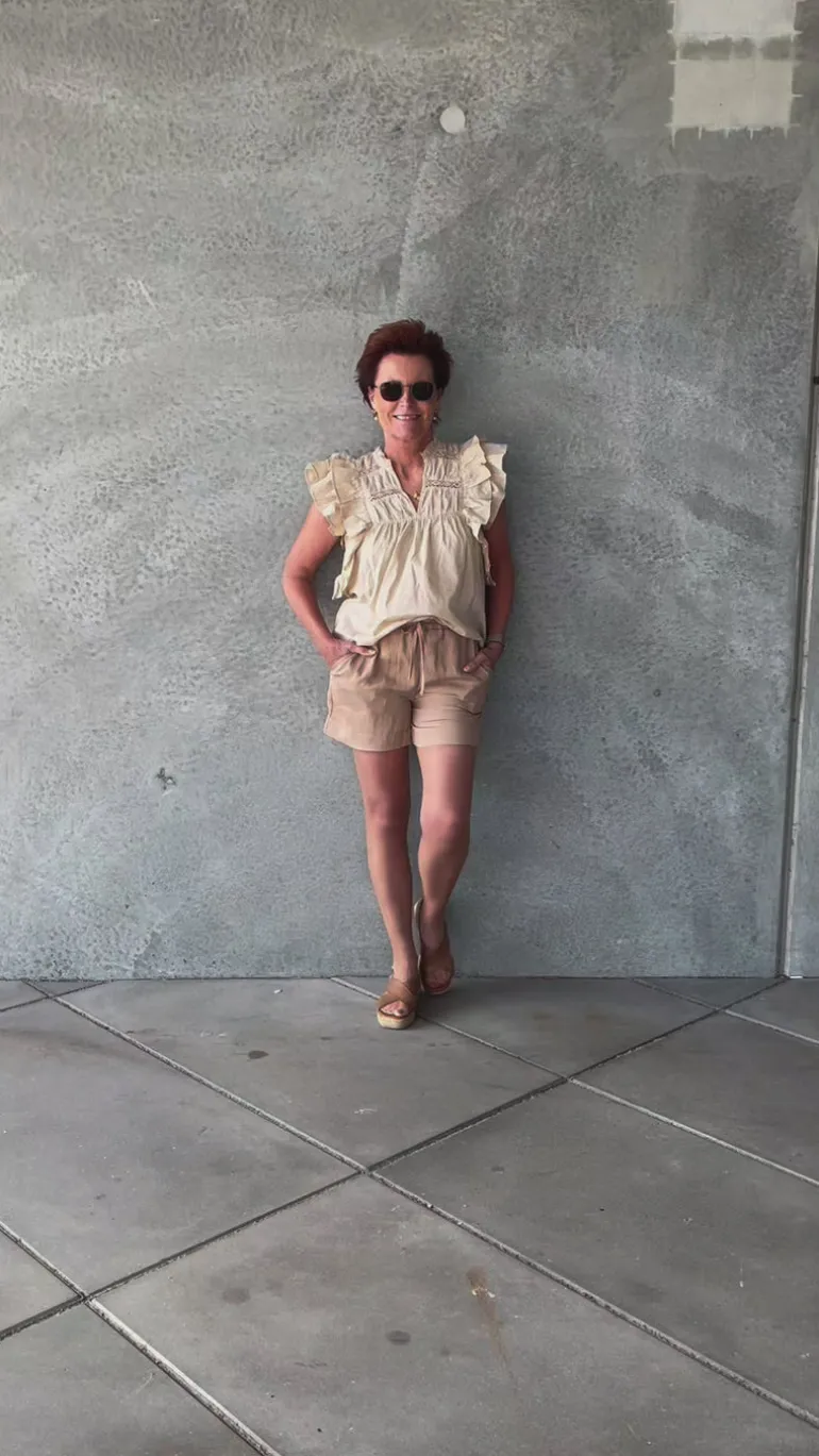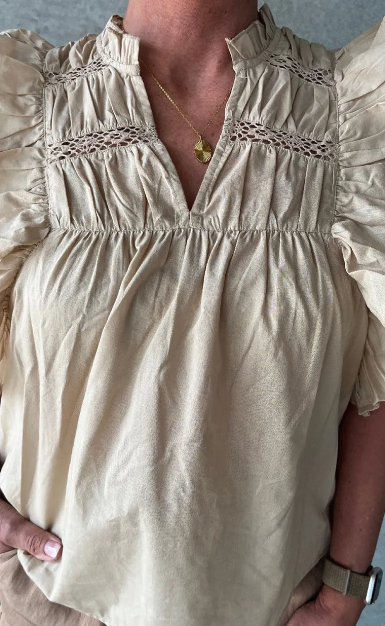 Toppen har en fin løs pasform og flæser ved ærmerne.