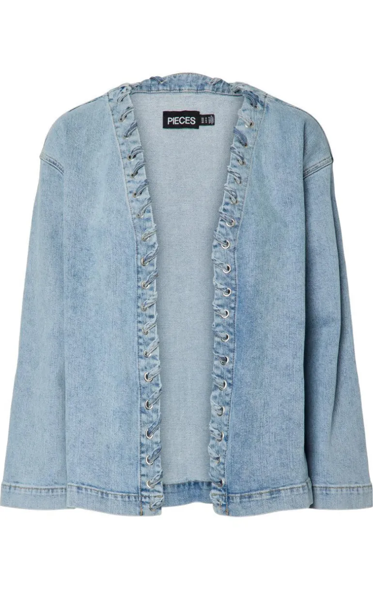 Fin denim jakke fra Pieces i lyseblå. Jakken er åbenstående.