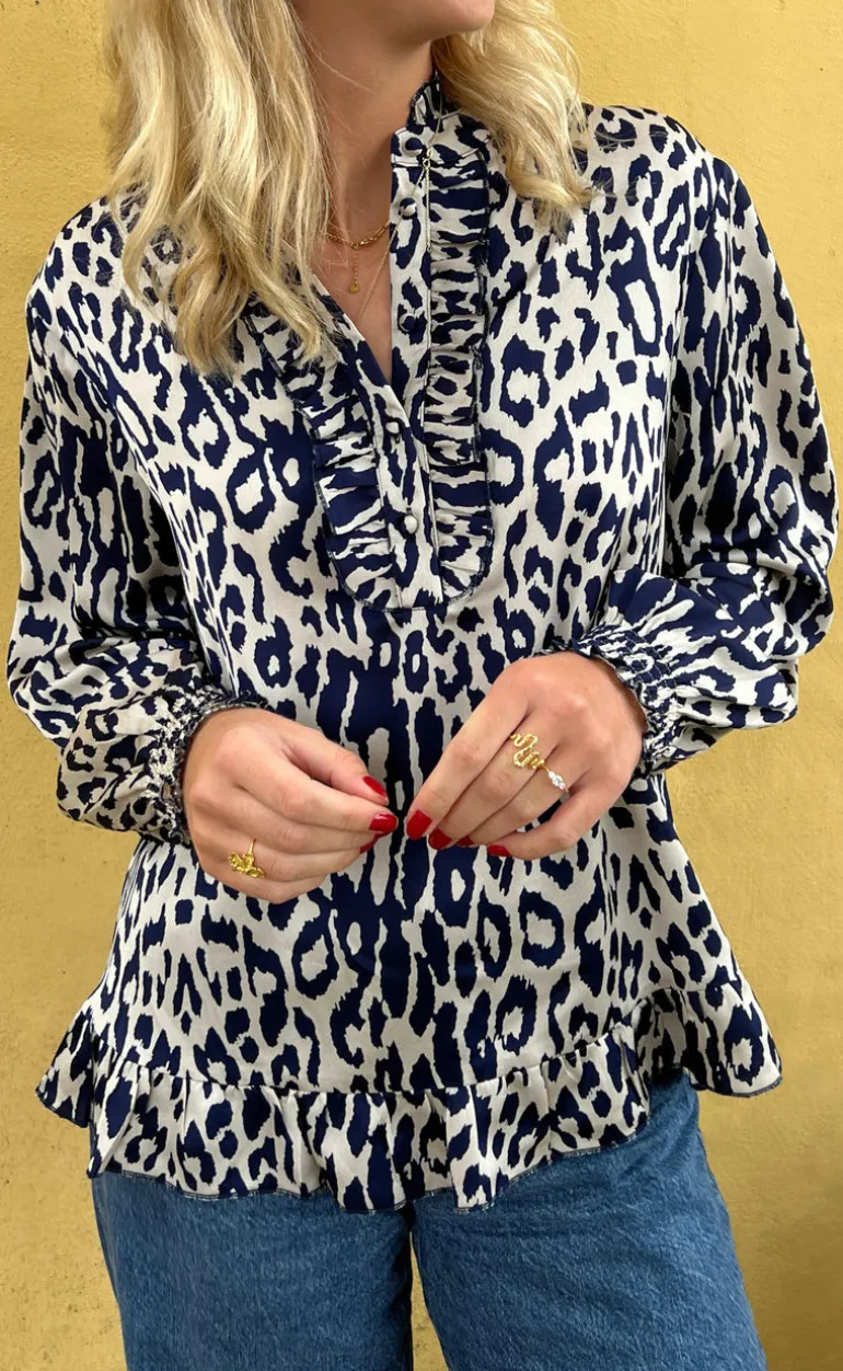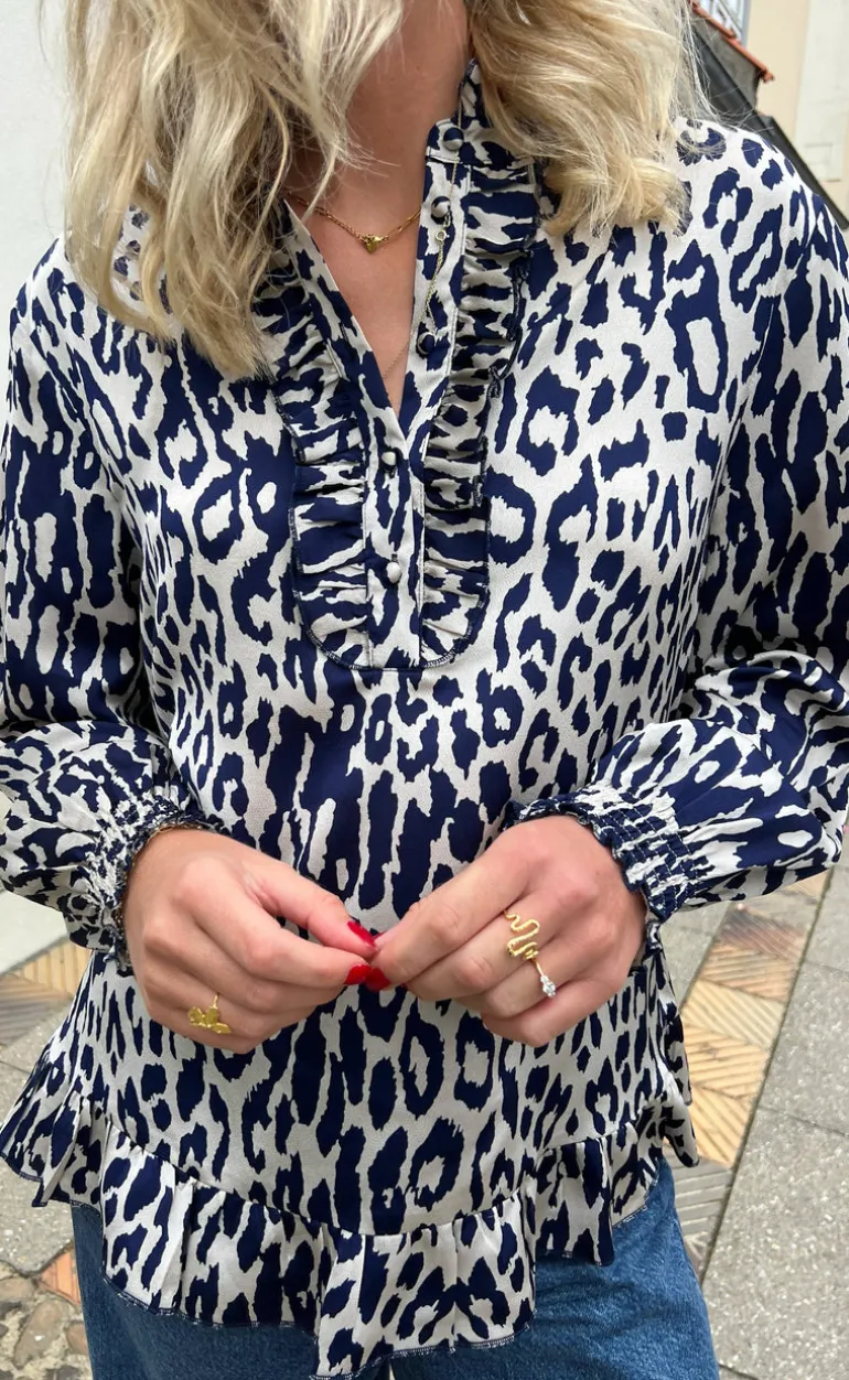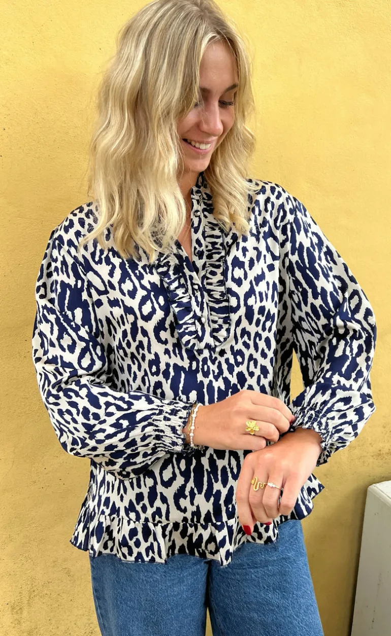 Fin bluse fra INA Copenhagen med leopard print i hvid og blå.