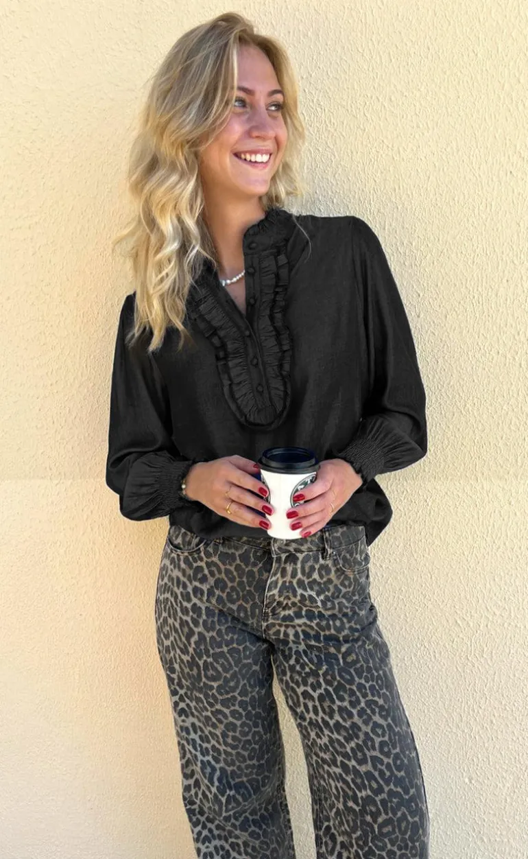 Blusen har den fineste åbning med knapper og flæser på fronten. Blusen har lange ærmer med smock i enden, så de kan trækkes op efter ønske.