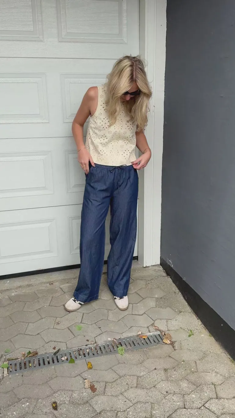 Bukserne kan styles på mange forskellige måder – f.eks. med matchende denim overdel fra INA Copenhagen.