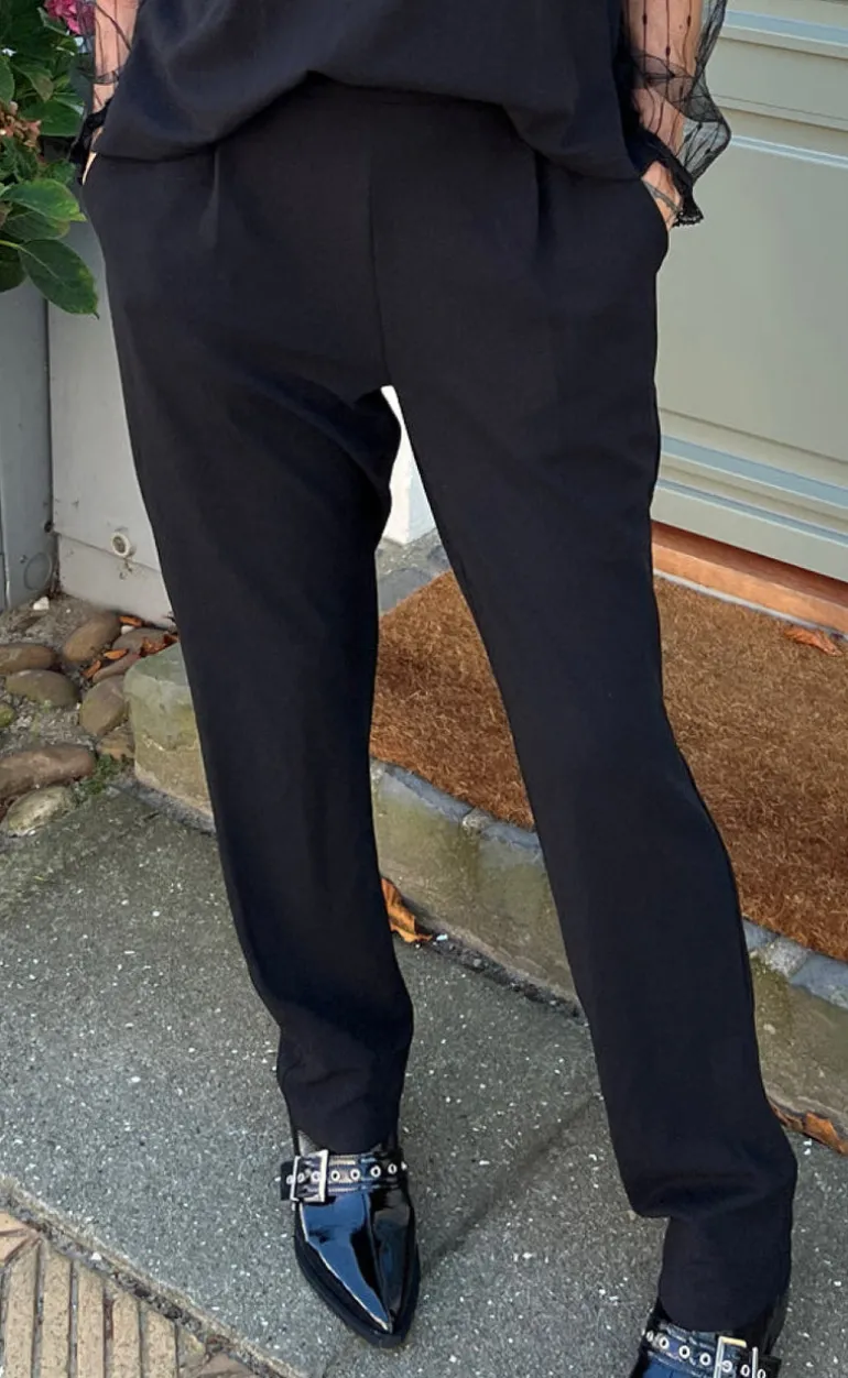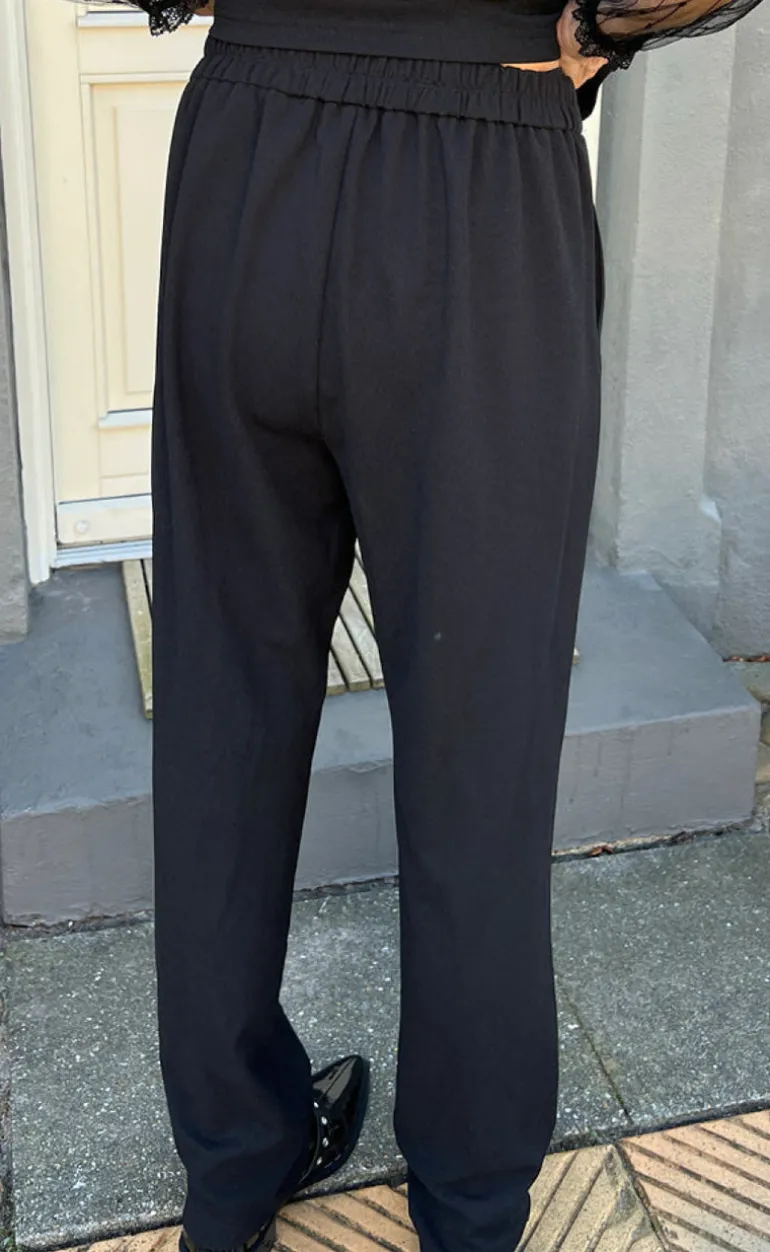Bukserne har elastik bagtil i buksekanten og de fineste folde-detaljer fortil.