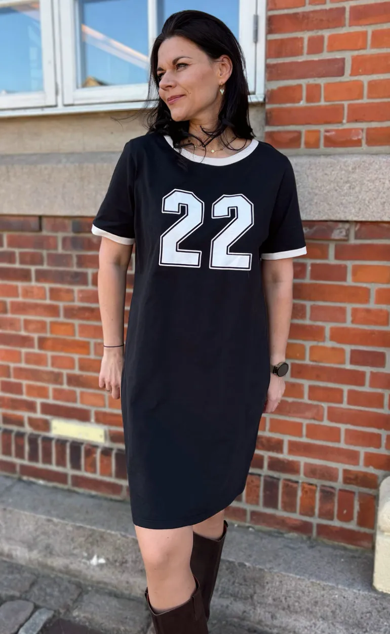 Den fineste kjole fra INA Copenhagen i sort, med et stort tal fortil, i hvid.