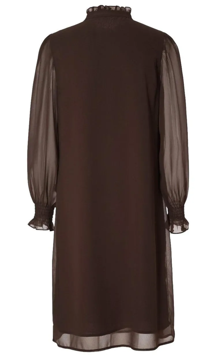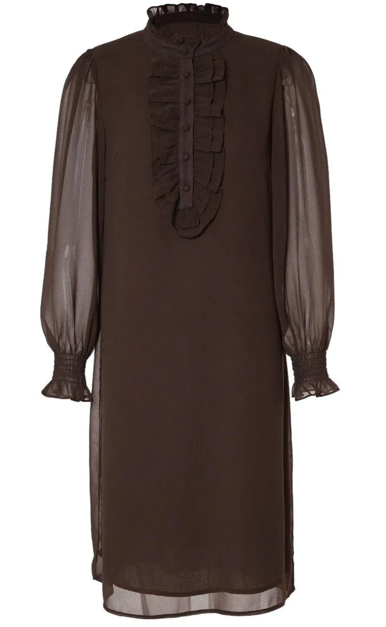 Smuk kjole fra INA Copenhagen i brun med de fineste flæser.