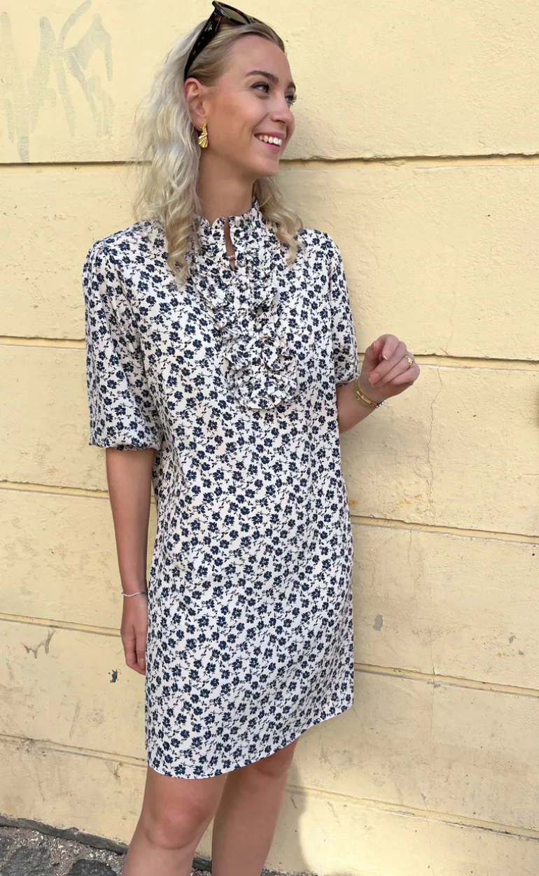 Smuk kjole fra INA Copenhagen i creme med blå blomster.