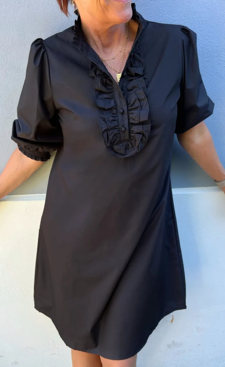 Kjolen har halv-korte ærmer med smock i enden og en åbning fortil med knapper og de fineste flæser.