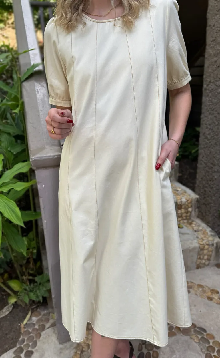Elegant kjole fra INA Copenhagen i creme hvid, med kontrat syninger i farven brun.