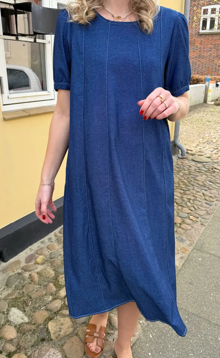 Elegant kjole fra INA Copenhagen i denim blå med kontrat syninger i hvid.