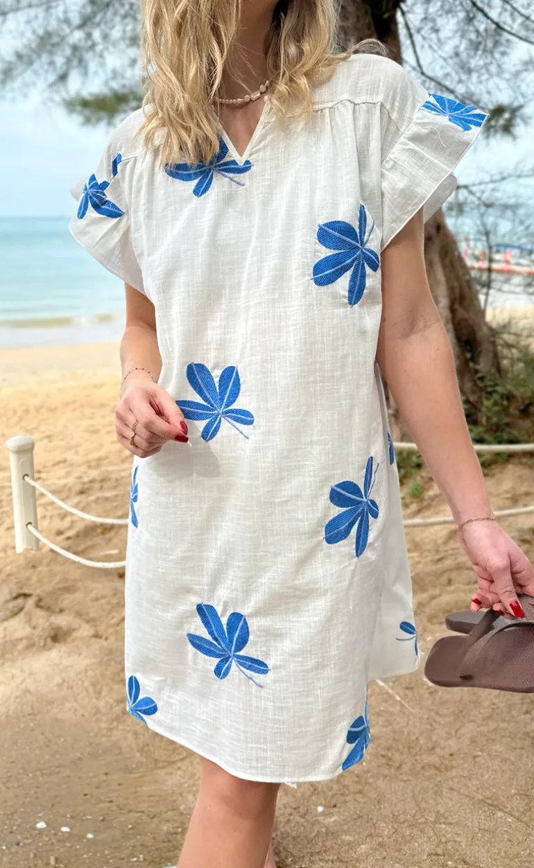 Virkelig smuk kjole fra INA Copenhagen i hør-look med broderede blomster i blå.