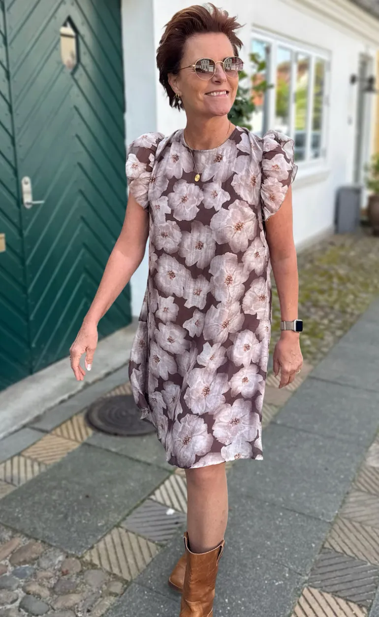 Fin kjole fra INA Copenhagen med blomsterprint i brune nuancer.