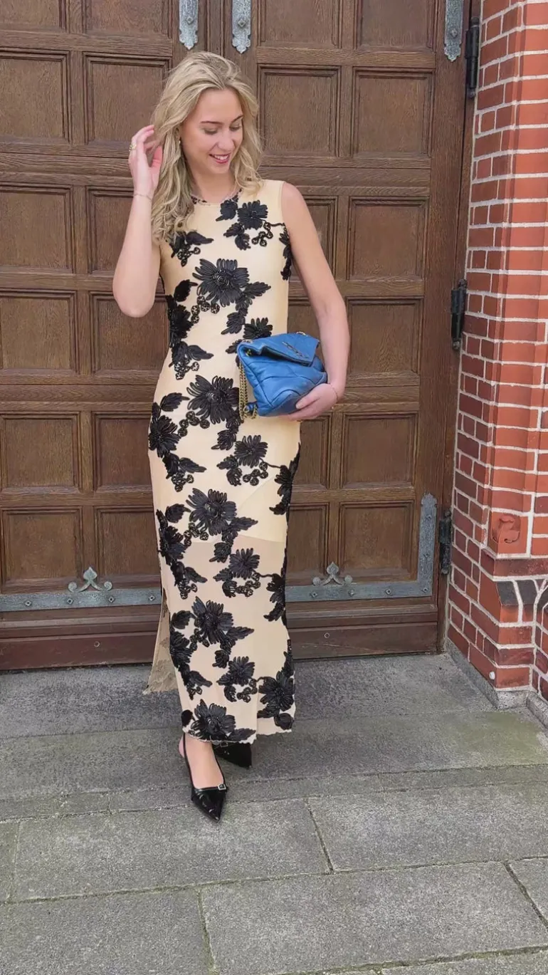 Eksklusiv kjole fra Say INA Copenhagen i beige mesh med flotte 3D blomster i sort.