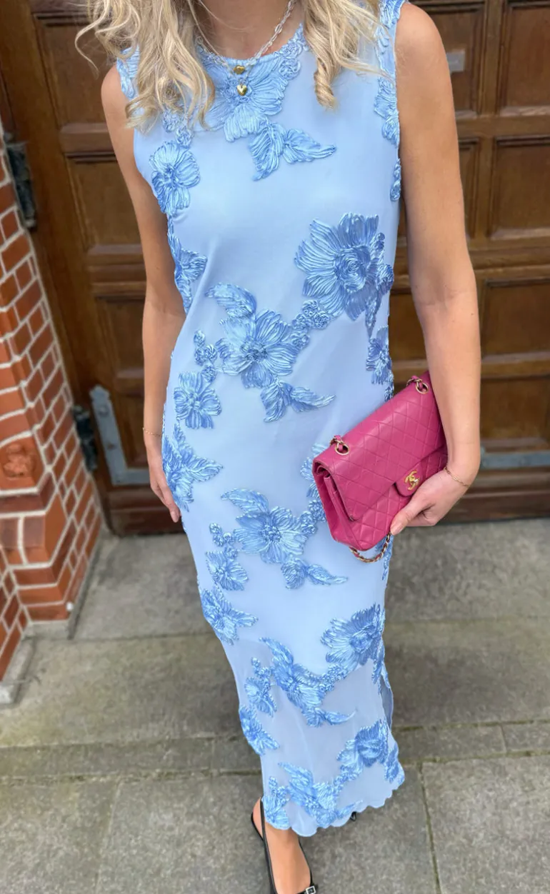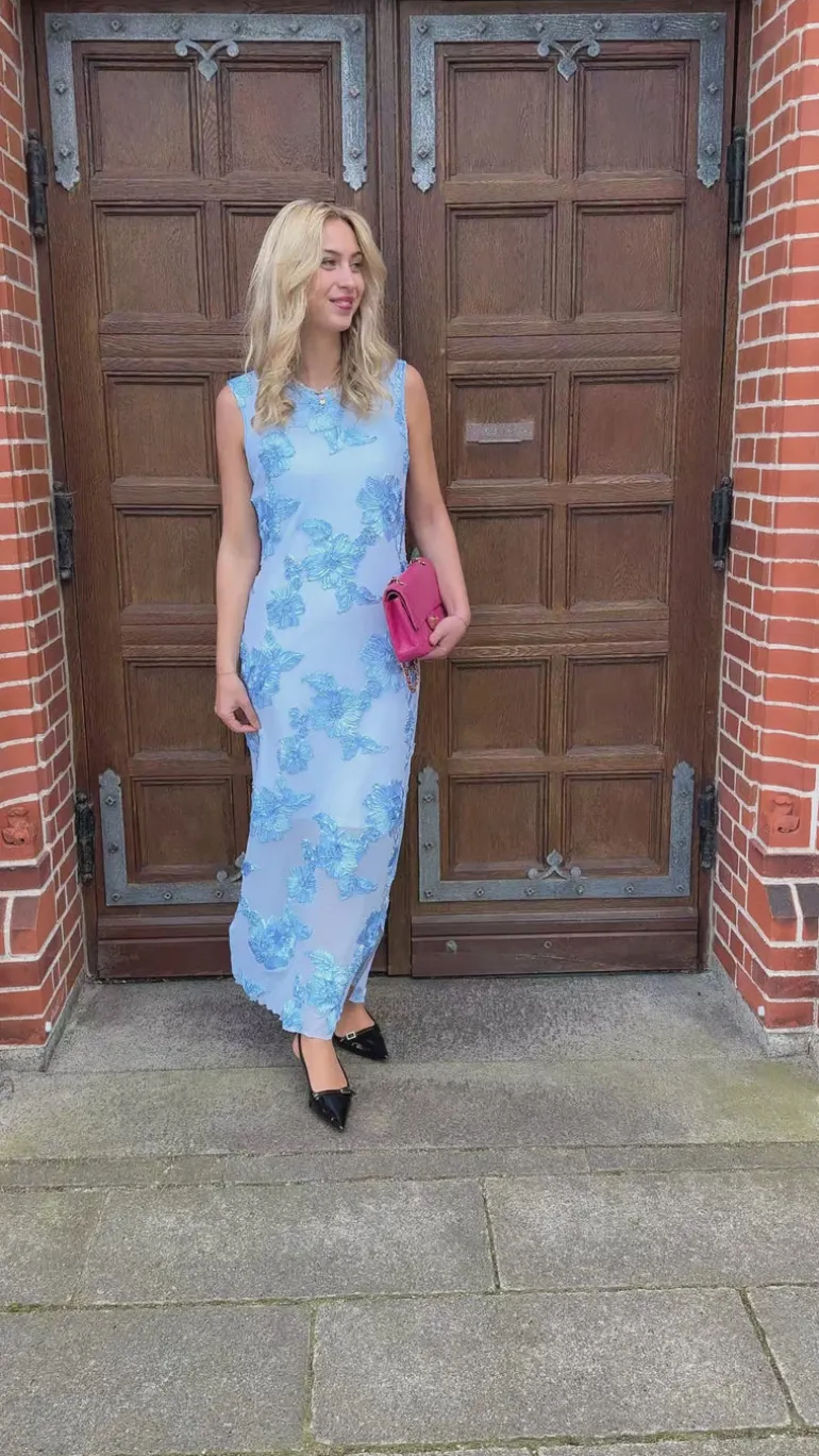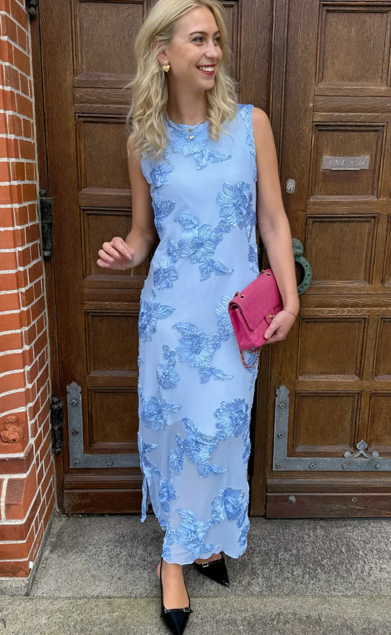 Elegant og eksklusiv kjole fra Say INA Copenhagen i blå mesh med flotte 3D blomster.