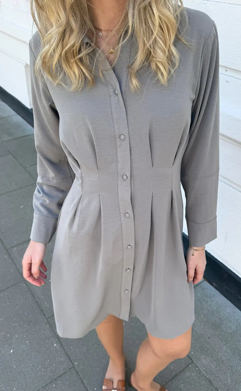 Kjolen har lange ærmer, åbnes med knapper fortil og har de fineste syningsdetaljer i siderne, så kjolen får et feminint udtryk.