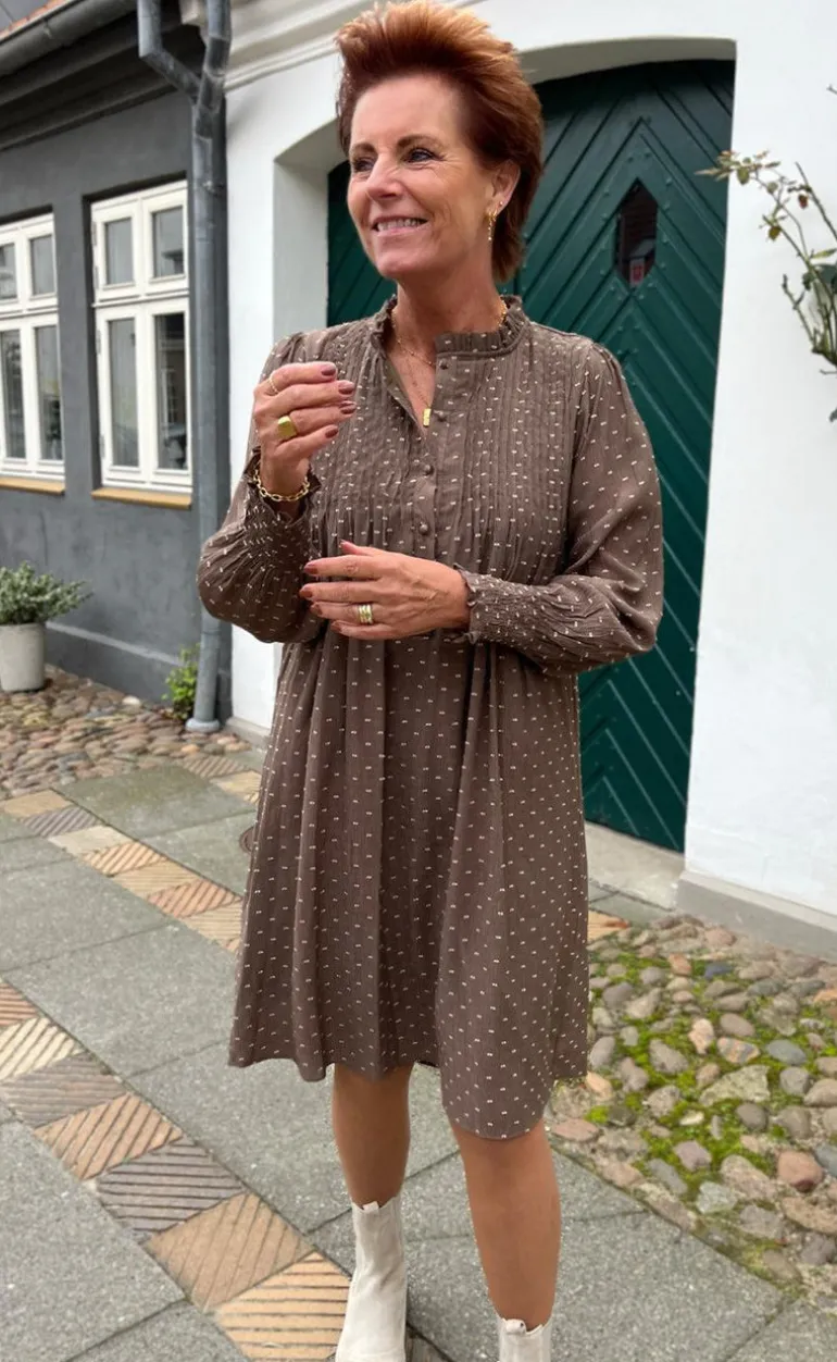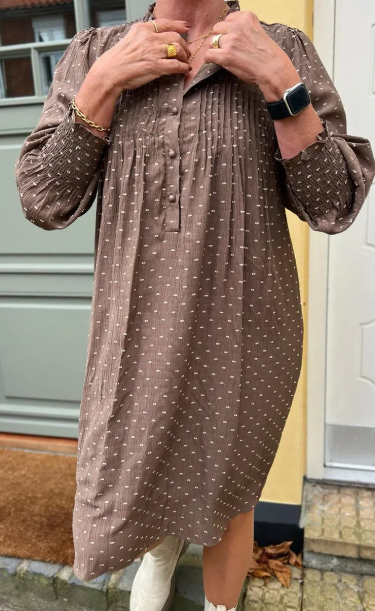 Kjolen har lange ærmer og en åbning med knapper i den øverste del.