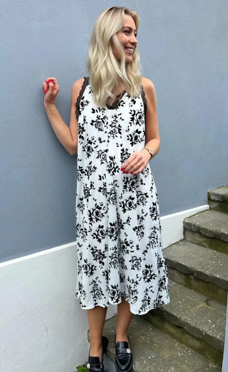 Elegant kjole fra INA Copenhagen i hvid med sorte roser og den fineste blondekant ved halsen.