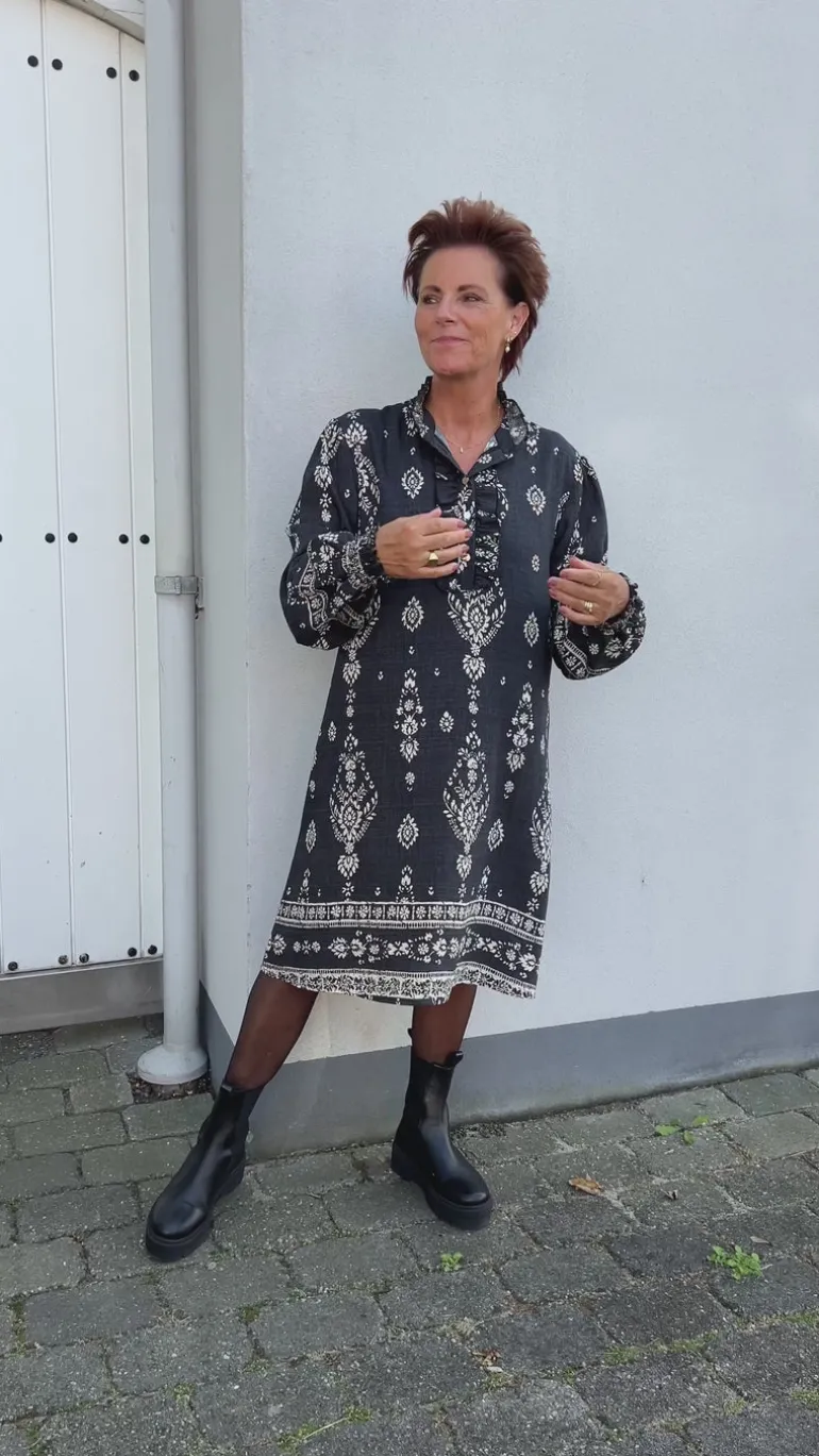Eksklusiv kjole fra INA Copenhagen i antracit farvet med paisley print.