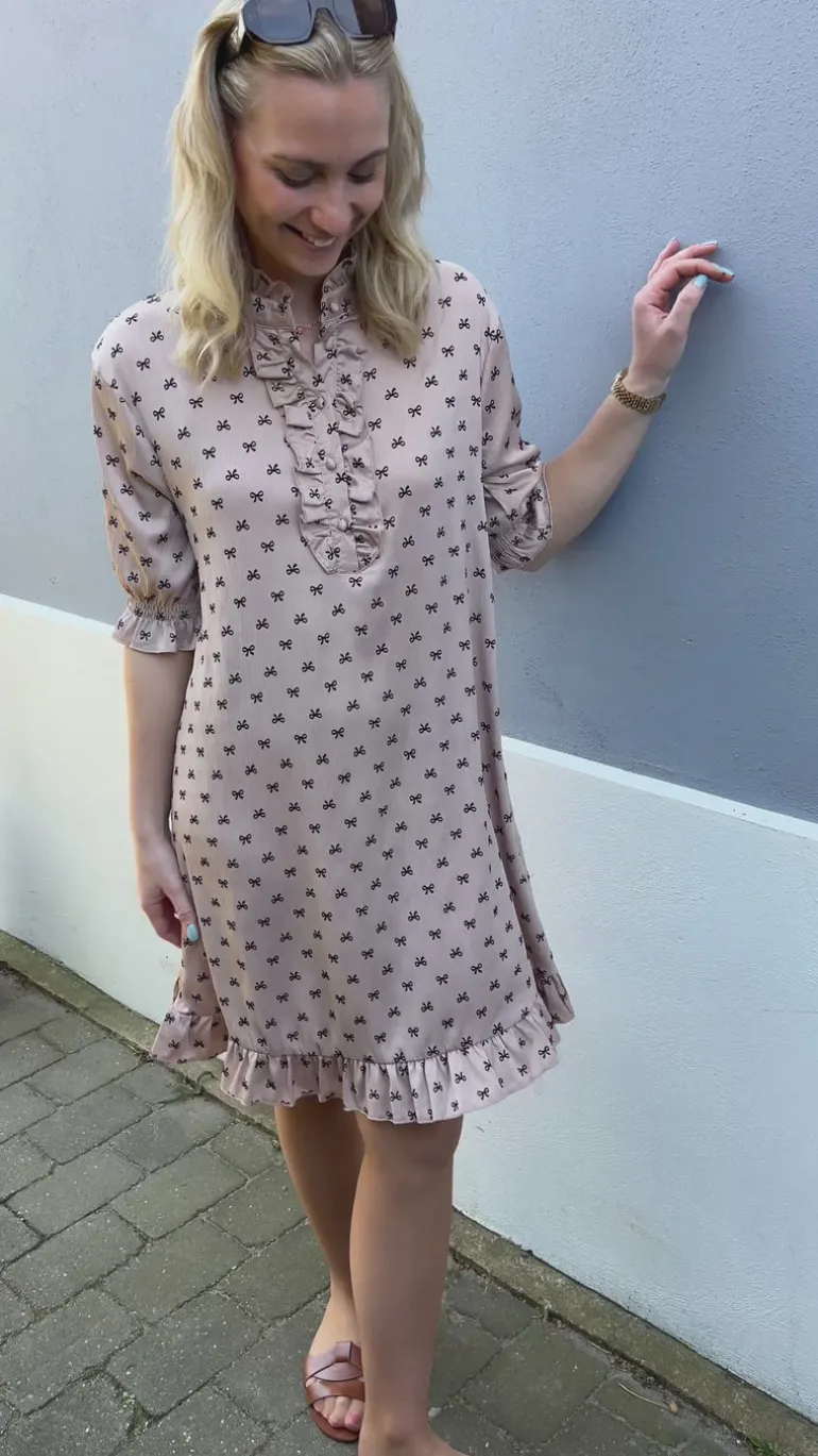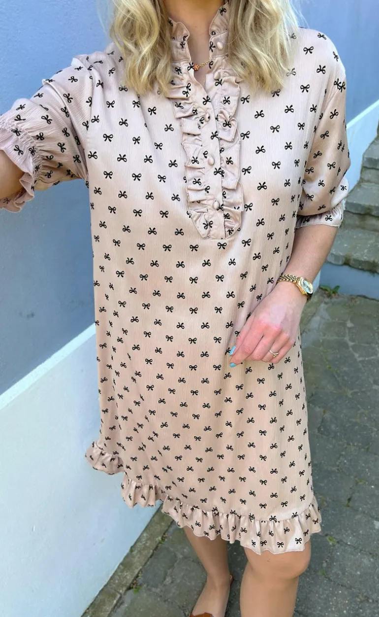 Fin kjole fra INA Copenhagen i en camel nuance med sorte sløjfer.
